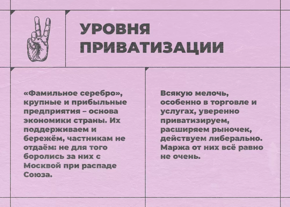 - Госсобственность не должна уходить из рук приближённых к государству хозяев в руки среднего и мелкого бизнеса.