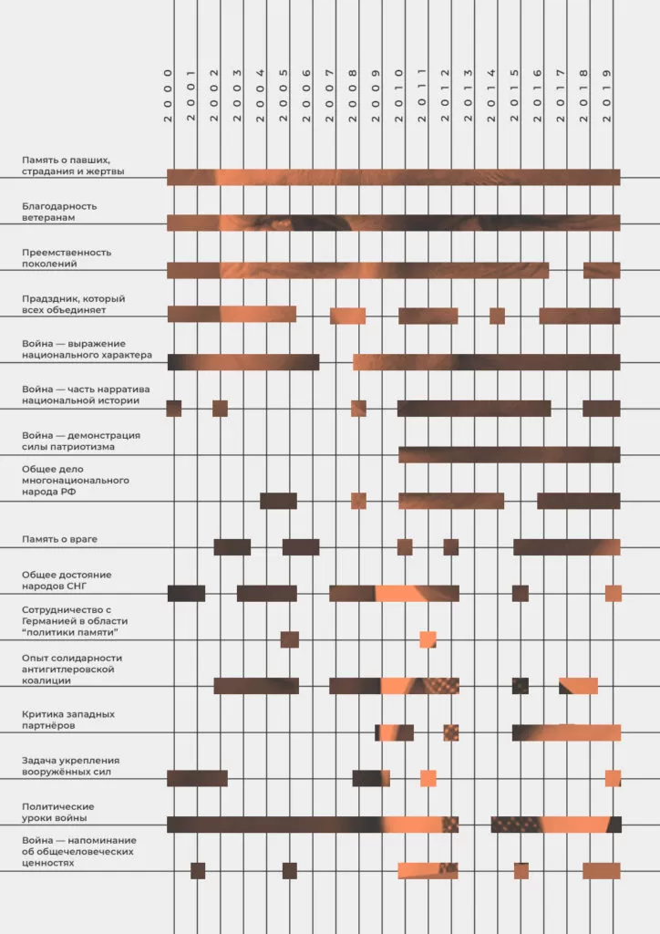 В нашей таблице14Источник смотри на «Киберленинке». можно наглядно увидеть ключевые идеологемы праздника. Повнимательнее её рассмотрев, вы также увидите, что с политическими и экономическими кризисами совпадает критика иностранных партнёров, призыв к укреплению вооружённых сил и речи о войне как демонстрации силы патриотизма.
