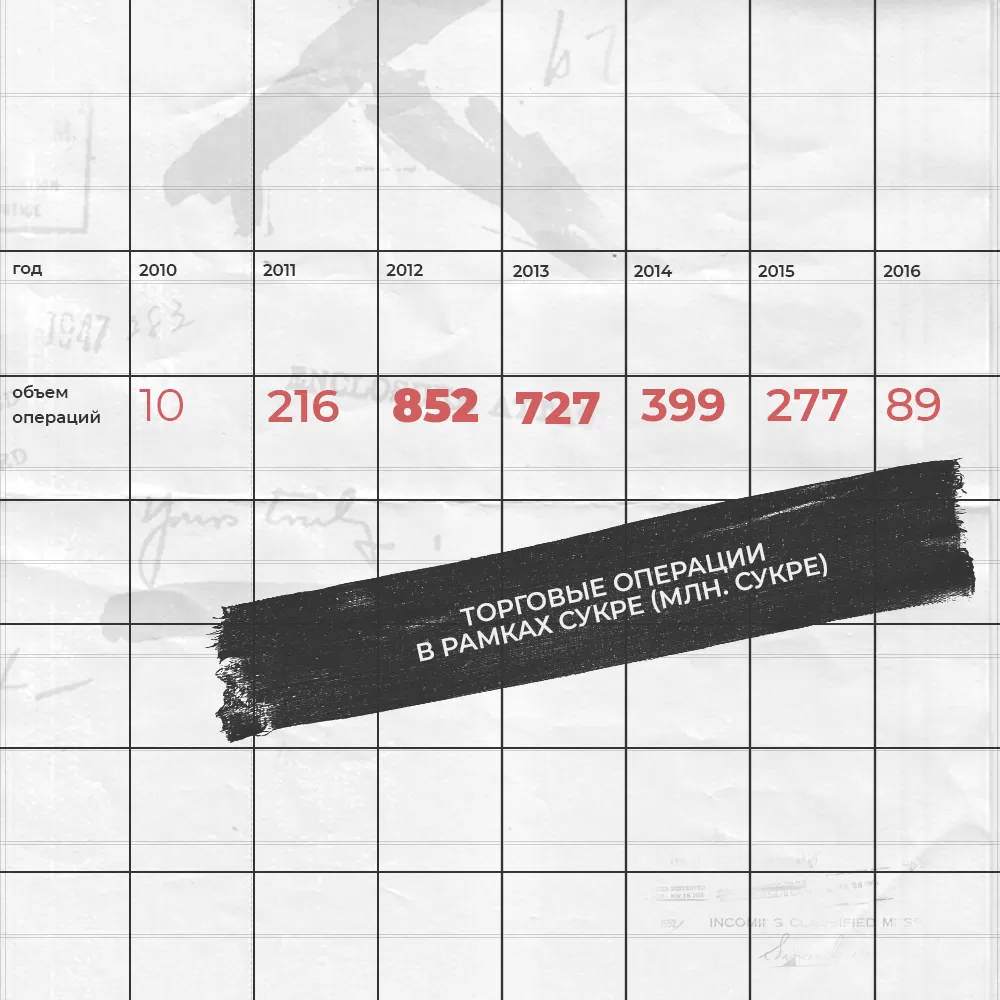 По официальным данным за 2016 год, с начала работы системы было осуществлено около 6 тысяч операций на сумму около 2,5 млрд сукре или 3,2 млрд долл. Примечательно, что 98% всех сделок пришлось на частный сектор и только 2% — на государственный27SUCRE. Informe de gestión institucional 2016. URL: http://www.sucreALBA.org/assets/informe_2016.pdf (Дата обращения 15.03.2021).. По нашему мнению, это говорит о низкой взаимодополняемости экономик стран АЛБА, а также о преимущественно двусторонних отношениях. Как следует из таблицы ниже28Ibidem., пик торговли пришёлся на 2012 год. В дальнейшем объём операций резко сокращается — с 850 до 89 млн сукре, т.е. примерно в 10 раз. (После 2016 года официальная статистика недоступна).