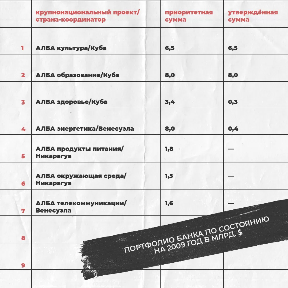 Центральным элементом системы стал Банк АЛБА, который был создан Советом президентов в 2008 году, чтобы продвигать устойчивое экономическое и социальное развитие. Уставной капитал организации на момент создания составил 1 млрд долл. с возможностью двукратного увеличения за счёт международных резервов участников21Acta fundacional del banco del ALBA. URL: http://www.portalalba.org/index.php/alba/documentos/1230-2008-01-26-vi-cumbre-caracas-venezuela-acta-fundacional-del-banco-del-alba (Дата обращения 15.03.2021)..