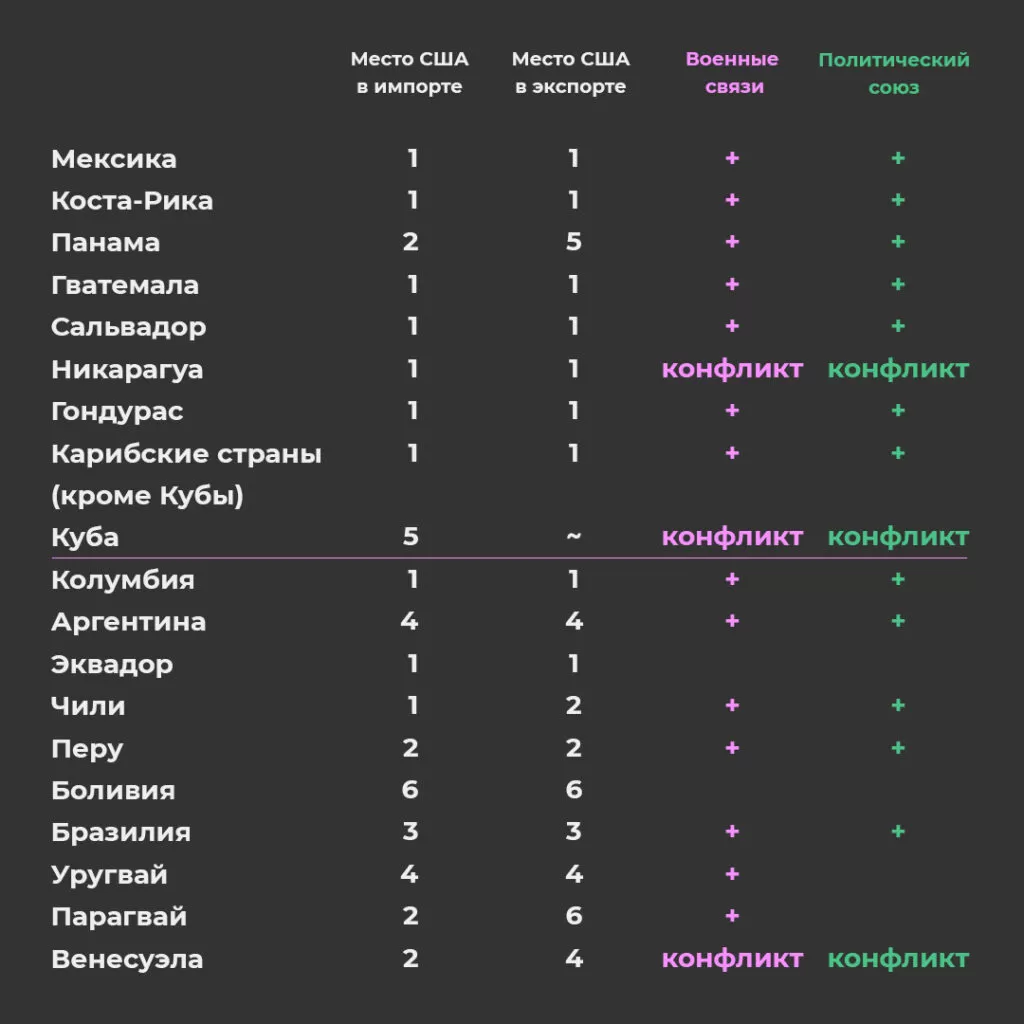 Западное полушарие не просто так называют «задним двором» Соединённых Штатов Америки. Это не просто фигура речи или политический штамп, это объективная реальность. США оказывают широкое воздействие на Латино-Карибскую Америку. Сегодня почти каждое внешнеполитическое решение Белого Дома так или иначе затрагивает латиноамериканские страны. Их экономики в разной мере встроены в американскую.