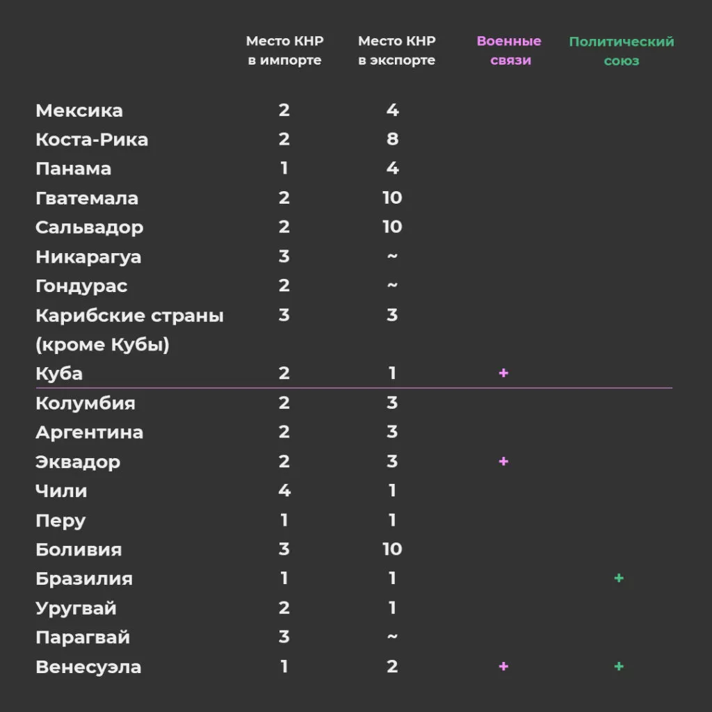 Латиноамериканские страны видели в Китае выгодную альтернативу западному капиталу, которая позволила бы им больше маневрировать во внешнеполитических и экономических направлениях. Кроме того, КНР, в отличие от Евросоюза и Соединённых Штатов, воспринимала латиноамериканских партнёров как равных. Пекин активнее шёл на уступки в ходе переговоров23Jenkins R. How China is reshaping the global economy: Development impacts in Africa and Latin America / N.Y.: Oxford University Press, 2019. – P.245.. К настоящему моменту Китай — один из ключевых экономических партнёров латиноамериканских стран. КНР стала главным импортёром полезных ископаемых и основным экспортёром средне- и высокотехнологичных товаров в регион. Существенный поток инвестиций в ЛКА обеспечивают китайские фонды и холдинги. Всё чаще государства Латино-Карибской Америки обращаются за кредитами к Пекину24Routledge handbook of Latin America in the world / edited by J.I. Dominguez and A. Covarrubias. – N.Y: Routledge, 2015. – P.212..