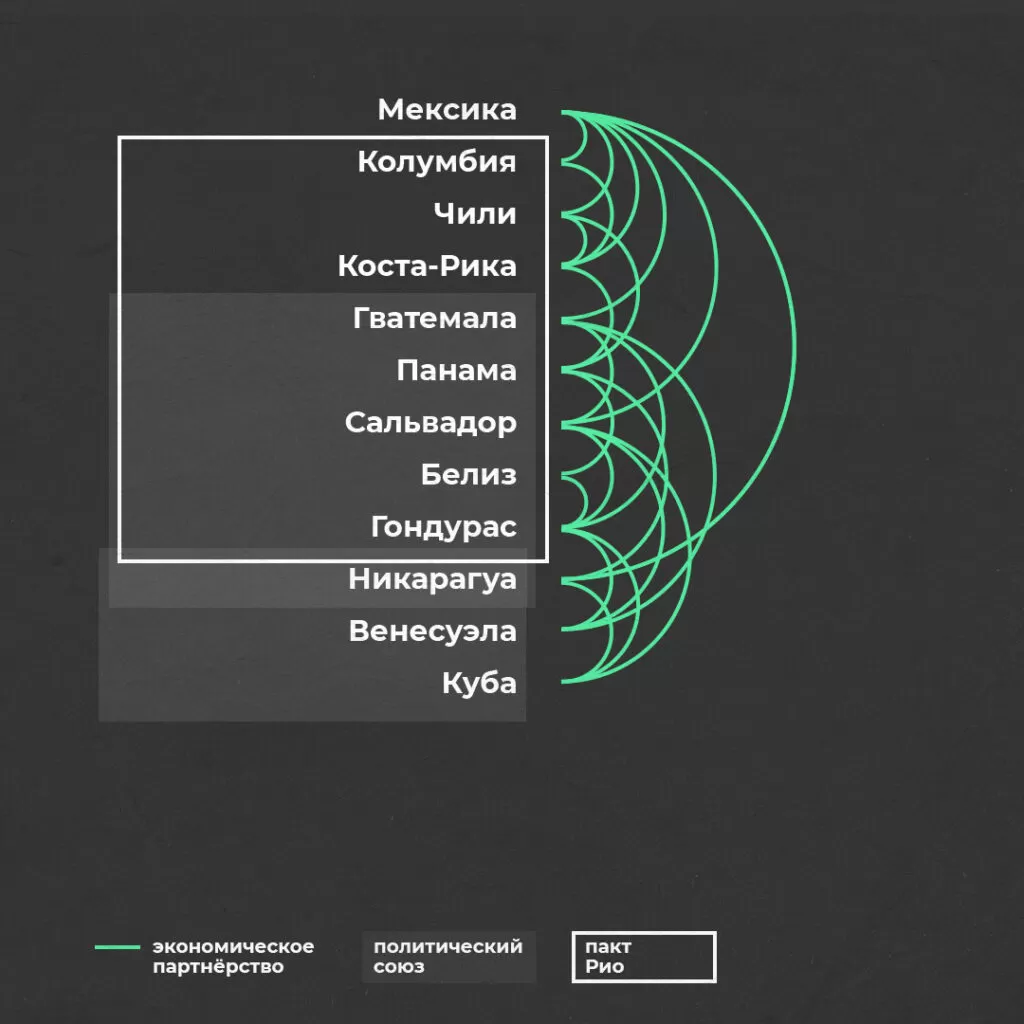 Схематичная структура взаимосвязей в рамках центральноамериканского субрегиона представлена на рисунке ниже. Кроме стран подрегиона, выделены некоторые другие латиноамериканские державы, тесно связанные с Центральной Америкой. Белой линией обрисованы государства, входящие в оборонительный пакт Рио14Межамериканский договор о взаимопомощи (также известен как пакт Рио) — соглашение о взаимной обороне между странами Америки. Было заключено в 1947 году. По договору нападение на одну из стран-участниц будет означать нападение на всех членов, подписавших пакт. В настоящее время в пакт Рио входят все страны Американского континента, кроме Кубы, Боливии, Мексики, Эквадора и Никарагуа. Членство Венесуэлы оспаривается.. Квадратами отмечены государства, объединённые общими политическими институтами. На нашей иллюстрации отображены Центральноамериканская интеграционная система и Боливарианский союз народов Америки. С помощью боковых линий обозначаются основные торговые партнёры той или иной страны.