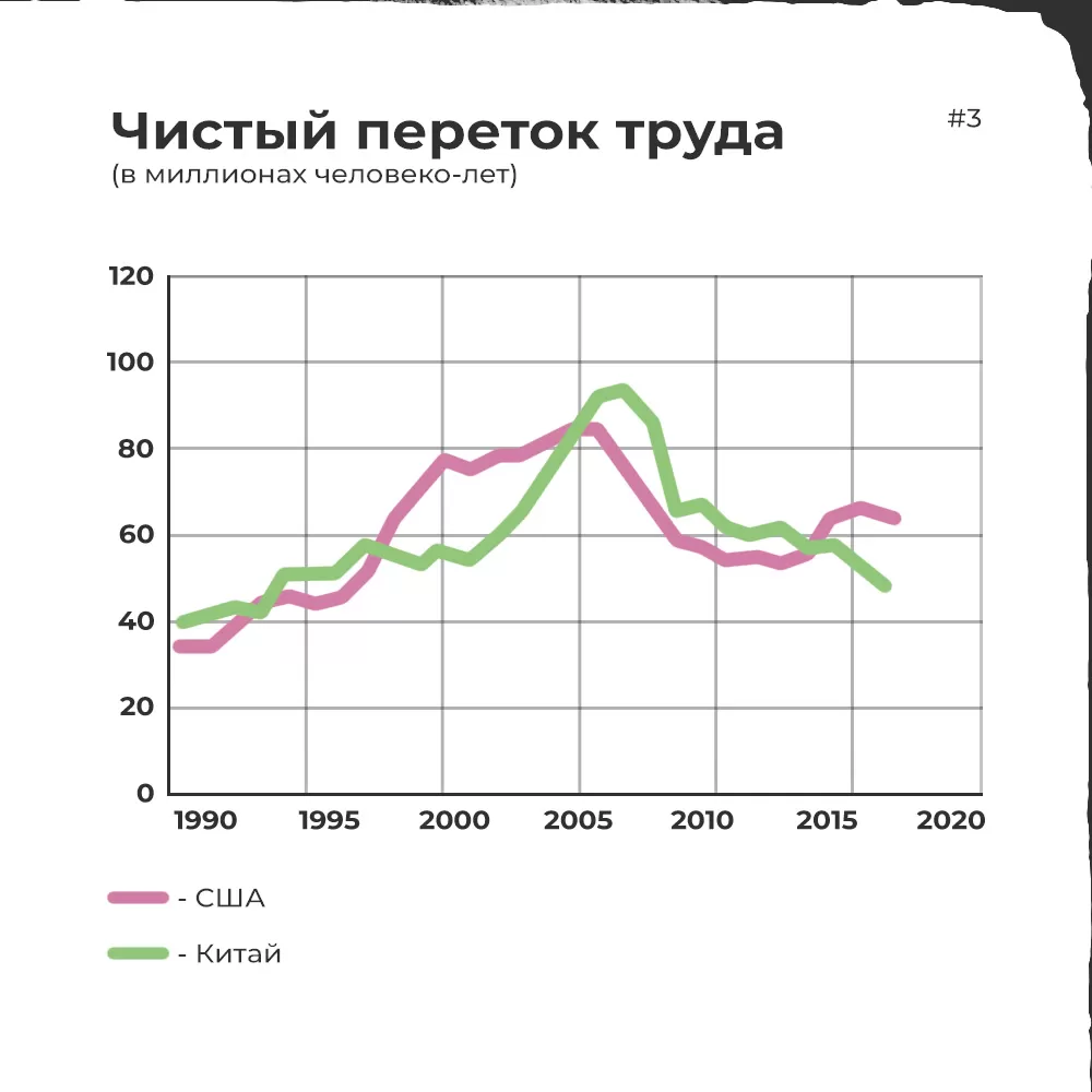 Любопытно, что начиная с 1990 года чистые потери труда Китая в значительной мере совпадают с чистым приростом труда США. В 1990 г. чистый прирост труда США составлял 34 млн человеко-лет, а чистые потери труда Китая — 39 млн человеко-лет. В 1997 г. чистый прирост труда США составил 52 млн человеко-лет, а чистые потери труда Китая — 57 млн человеко-лет. В 2005 г. чистый прирост труда США достиг пика в 84 млн человеко-лет. На 2007 г. пришёлся максимум чистых потерь труда Китая — 94 млн человеко-лет. К 2014 г. этот показатель у Китая упал до 58 млн человеко-лет, а чистый прирост труда США — до 56 млн человеко-лет. После этого изменения в приросте и потерях труда США и Китая пошли в разные стороны. В 2017 году чистый прирост труда США составил 63 млн человеко-лет, а чистые потери труда Китая упали до 47 млн человеко-лет.
