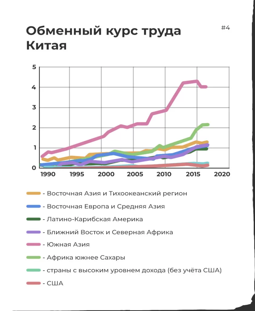 Исходя из этих наблюдений, можем ли мы считать, что Китай остаётся периферийной страной в мир-системе? Ответ на этот вопрос зависит от анализа его экономических отношений не только с империалистической частью мир-системы, но и с периферией. На графике 4 показана динамика обменного курса труда Китая в сравнении с этим же показателем для разных регионов за период 1990-2017 годов.