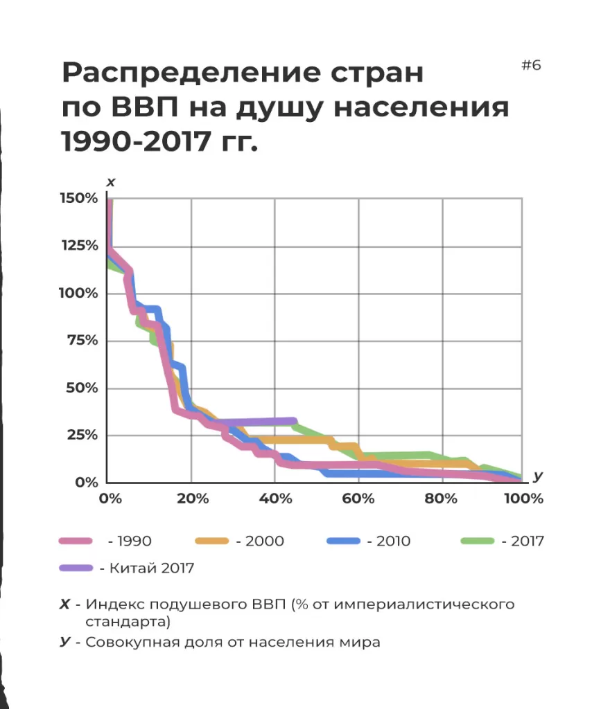 Однако к 2017 г. структура распределения доходов в мире кардинально изменилась. ВВП на душу населения Китая поднялся до 31 % от «империалистического стандарта». Доля населения мира, живущая в странах с ВВП на душу населения менее 25 % от «стандарта», снизилась до 50 % (и это наименьшее значение с 1870 г.). Доля населения в странах с ВВП на душу населения более 75 % от «империалистического стандарта», уменьшилась до 12 %. В то же время удельный вес населения в странах с ВВП на душу населения между 25 и 75 % от «империалистического стандарта» увеличился до 38 % (доля населения полупериферии увеличилась почти вдвое).