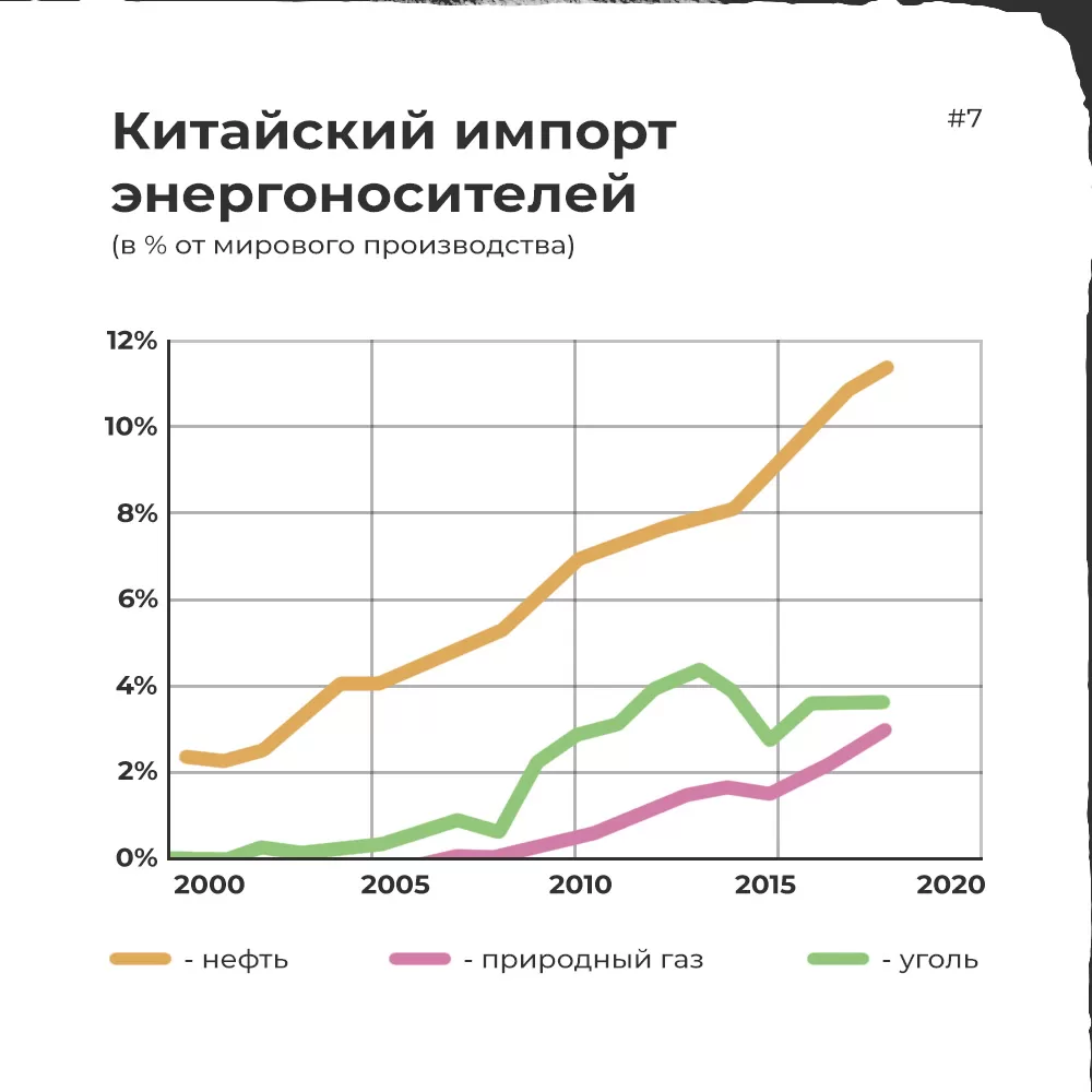 Сегодня Китай — одновременно крупнейший мировой импортер нефти, природного газа и угля. На графике 7 показана доля китайского импорта нефти, природного газа и угля от всей мировой добычи с 2000 по 2018 годов.