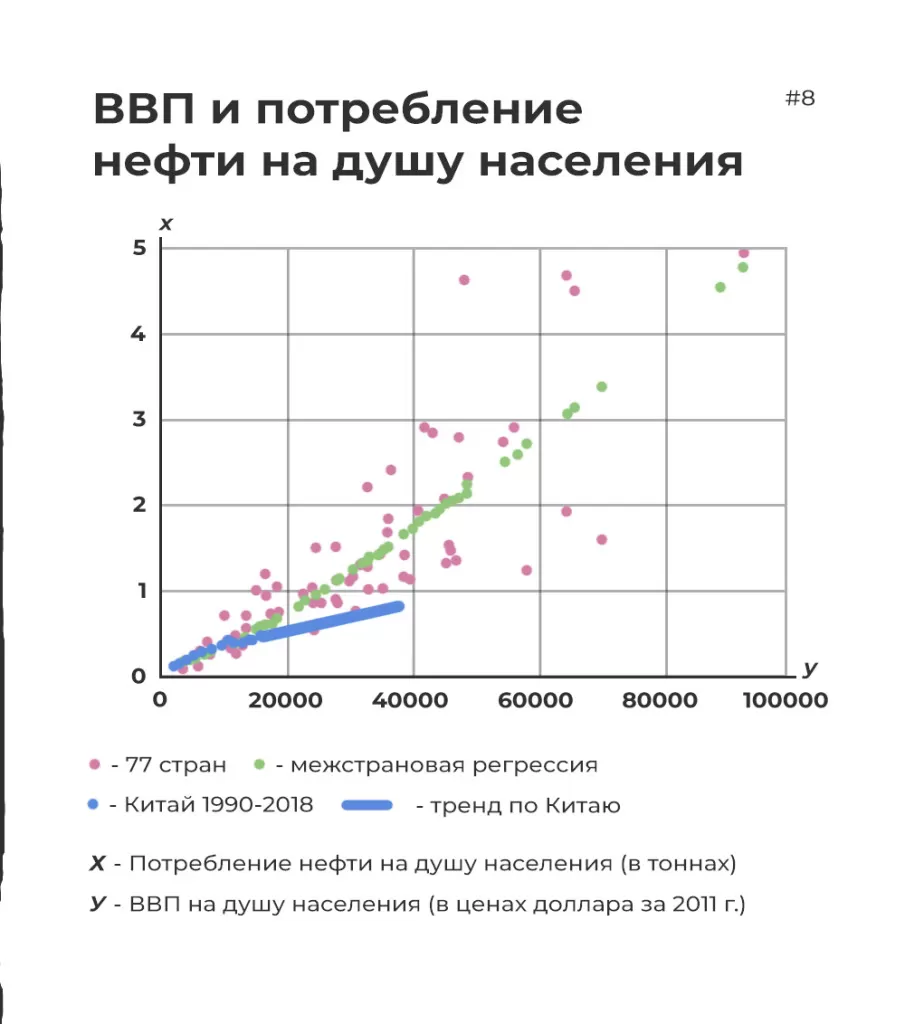 Кто-то возразит, что потребление Китаем нефти можно значительно сократить путем повышения энергоэффективности. Однако прогнозы на основе ретроспективных данных по Китаю уже отражают будущую картину подушевого потребления нефти в стране. Учитывая разницу в доходах, Китай окажется в нижней точке диапазона межстрановых колебаний (см. график 8). В то же время этот прогноз построен на оценке «империалистического стандарта» по показателям ВВП на душу населения за 2018 г. Если в будущем подушевой ВВП четырех исторически крупнейших империалистических стран продолжит расти (что наиболее вероятно), то «стандарт» соответственно будет увеличиваться. Тогда связанный с ним уровень потребления нефти на душу населения тоже вырастет. Скорее всего, любая «экономия» потребления нефти за счёт повышения энергоэффективности будет значительно или полностью сведена на нет обратным эффектом, вызванным повышением «империалистического стандарта».