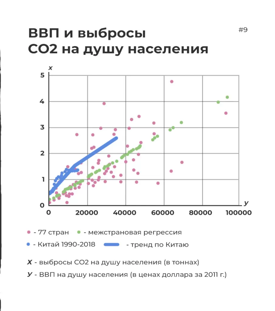 На графике 9 показано соотношение между ВВП на душу населения (в ценах доллара за 2011 г.) и выбросами углекислого газа на душу населения (в тоннах) в 2018 г. для 77 стран со значительным потреблением энергоносителей.46BP, Statistical Review of World Energy 2020. График также отражает ретроспективу выбросов углекислого газа на душу населения в Китае в 1990-2018 годы.