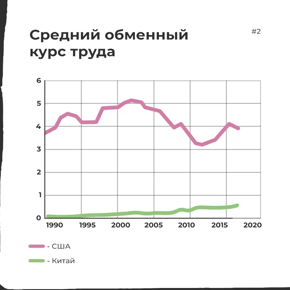 На графике 2 приведено сравнение среднего обменного курса труда между Китаем и США. Этот показатель определяется количеством труда из-за границы, которое можно обменять на одну единицу национального труда в процессе обмена экспортируемых и импортируемых товаров с одинаковой рыночной стоимостью.