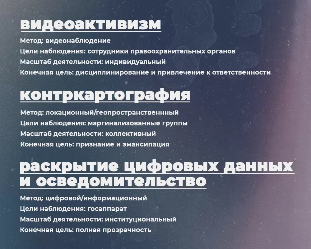 Мы рассмотрели лишь некоторые практики контрнаблюдения, но уже видим, насколько они разнообразны по масштабам, технологиям, задачам и сферам применения.