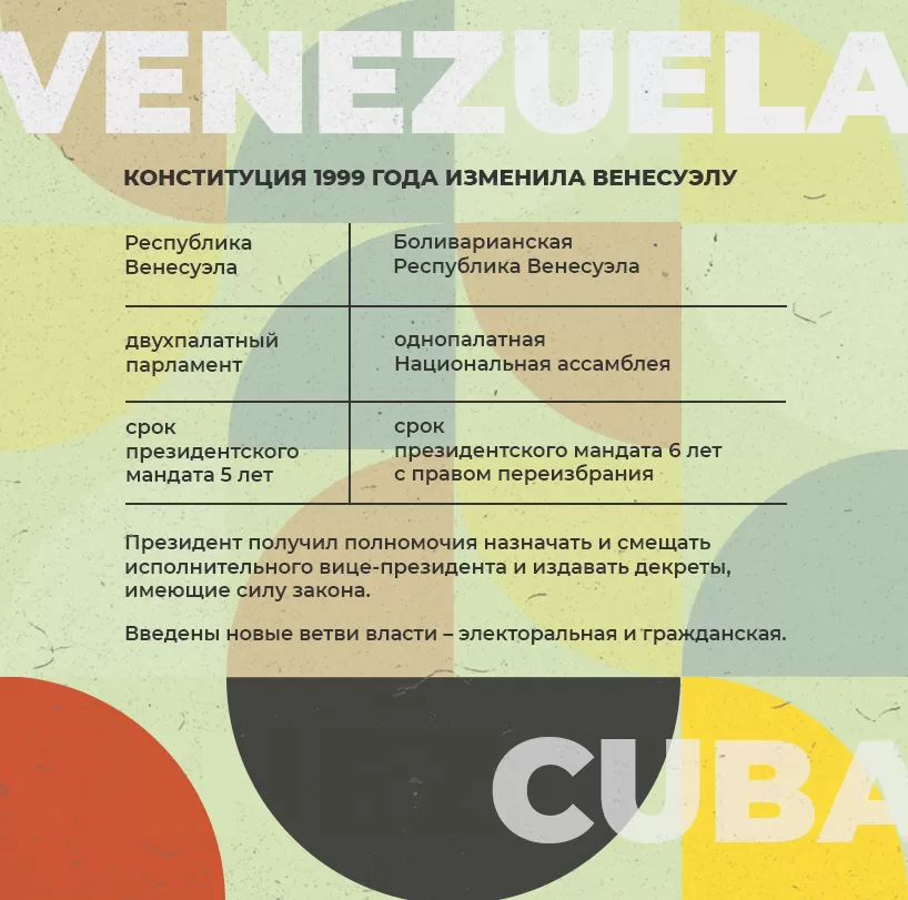 Отчасти мы с ними согласны, потому что в устройствах Кубы и Венесуэлы есть и правда много общего. К примеру, на Кубе низовая самоорганизация основана на общественных советах, а в Венесуэле — на коммунальных советах. Другой пример — обе системы сильно централизованы, тогда как разделения властей фактически нет.