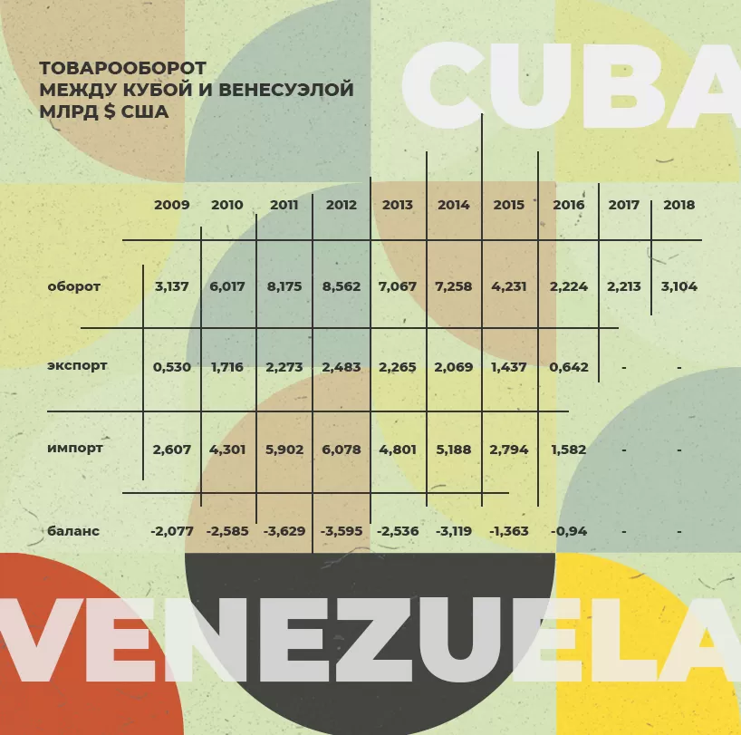 Учитывая, что Венесуэла остаётся главным торговым партнёром Гаваны (её доля в суммарном торговом обороте Кубы в 2017 году составила около 17%, в то время как доля Кубы в торговом обороте Венесуэлы — всего 4%27Подсчитано автором по Anuario Estadístico de Cuba 2018. Cuentas Nacionales. Edición 2019. ONEI. The observatory of economic complexity. Venezuela. Available at: https://oec.world/es/profile/country/ven/#Exportaciones (accessed 04.02.2020). ), падение национальных доходов Боливарианской республики ставит под угрозу дальнейшее расширение экономической интеграции. Не спасает ситуацию и экспорт кубинских услуг, ежегодная стоимость которого (по данным того же К. Меса-Лаго) равна 4,7 млрд евро, или 6,5 млрд долларов США, что в значительной мере компенсирует торговый дисбаланс.