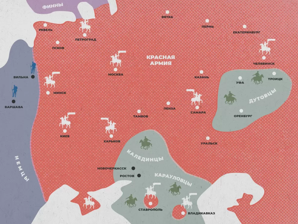 Большевики отбирали заводы, громили государство и отпускали нации в свободное плавание. Ничто не предвещало беды, пока господа не очухались. Они слишком сильно дорожили роскошной жизнью, чтобы отдавать её черни. Пока белые звонили немецким родственникам, восстали передовики крепостного общества — чиновники, казаки, эсеры. Они создавали правительства, стреляли в Ленина и срывали Учредительное собрание.