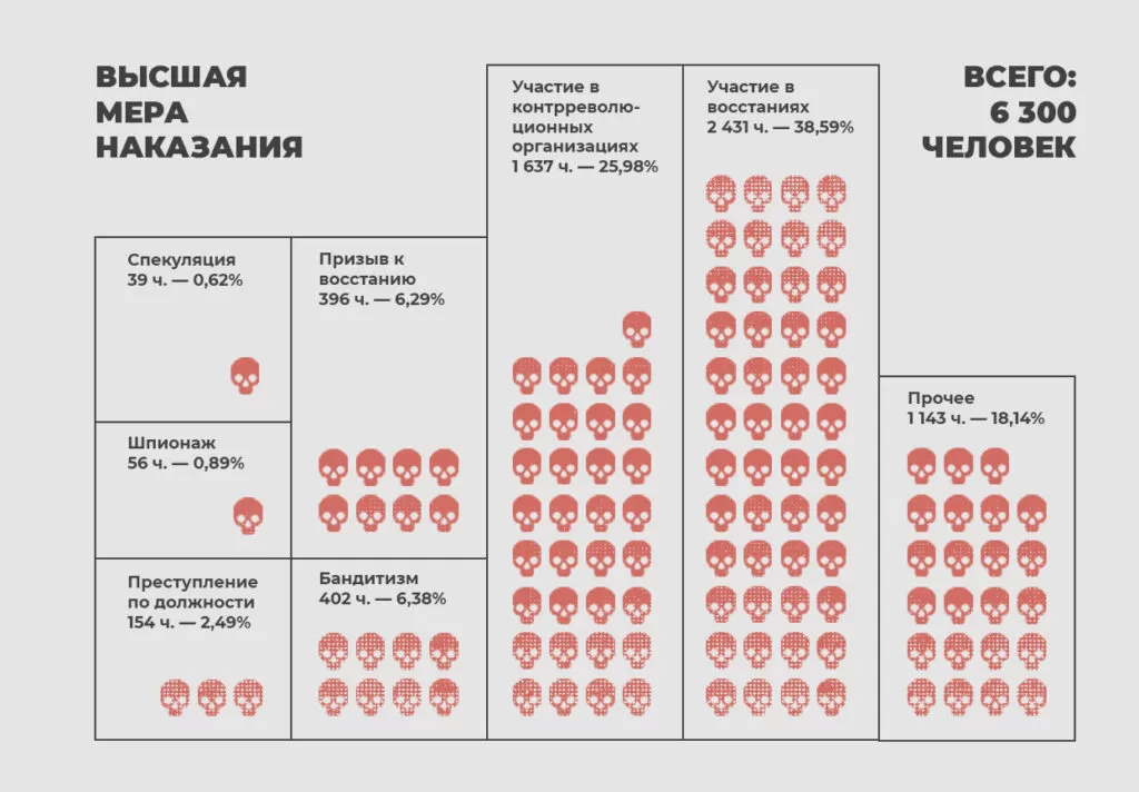 Чекисты злоупотрябляли полномочиями, когда встречались с врагами Советской власти. Например, М.А. Муравьёв расстрелял в Киеве 1000 кадетов, потому что они расстреляли 700 рабочих-коммунистов. Центр не оценил самоуправство чекиста и осудил его21Ратьковский И.С. Хроника Красного террора. Карающий меч революции. – М., 2017. – с. 74.. В основном большевики приговаривали к штрафам, общественным работам и заключениям в тюрьме, но сведения по расстрелам лучше отражают общественное напряжение. Большинство расстрелянных — за участие в восстаниях (2431 человек, или 38%) и контрреволюционных организациях (1637 человек, или 26%) — половина всех смертных приговоров. Следующие примечательные категории — «за бандитизм» (402 человека, или 6%) и «спекуляция» (39 человек, или 0,6%). Мы видим, что большевики опасались не преступников в обычном понимании, а контрреволюционеров, поэтому им выносили приговор на месте. Данные о расстрелах по остальным категориям, таким как «дезертирство», «за шпионаж», «призыв к восстанию», представлены в таблице. Если посмотреть на социальный состав, большинство расстрелянных — это бывшие офицеры, «белогвардейцы», чиновники и провокаторы. Первую половину 1918 года расстрелы не касались крестьян и рабочих, по крайней мере их дела не встречаются в архивах. В результате политика ВЧК стабилизировала положение в городах: «Известия ВЦИК» писали, что в декабре 1917 года в Петрограде зафиксировали 1368 правонарушений (около 45 в сутки), тогда как в январе 1918 года — 699 (около 22 в сутки)22«Известия ВЦИК». – № 49 от 15 марта 1918 г..