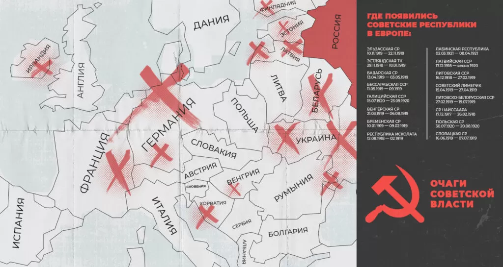 Из России в Европу проникали Советы. В 1917 году рабочие пытались их создать в Берлине и Лейпциге во второй половине апреля, в Праге — в июле, когда там избрали нелегальный Центральный рабочий Совет, в Англии — летом и осенью.