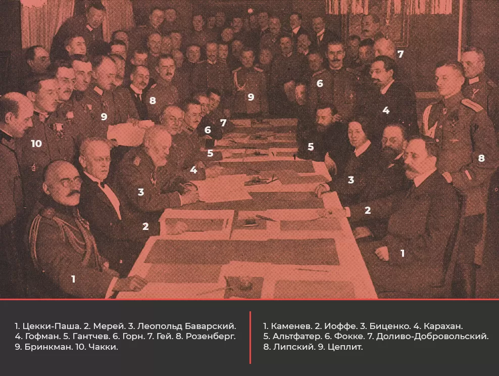 Только после этого, 20 ноября, Советская делегация встретилась с немцами в Брест-Литовске. На переговоры поехали большевики А.А. Иоффе, Г.Я. Сокольников, Л.М. Карахан, левые эсеры А.А. Биценко и С.Д. Мстиславский, рабочий Н.А. Обухов, крестьянин Р.Н. Сташков, солдат Н.К. Беляков, матрос Ф.В. Олич и «приглашённые в качестве консультантов сочувственно настроенные к Советской власти военные специалисты контр-адмирал В.М. Альтфатер и капитан 1 ранга Б.И. Доливо-Добровольский»22Утро страны Советов. Воспоминания участников и очевидцев / Сост. М.П. Ирошников. — Л. : Лениздат, 1988. — С. 39.. Советская делегация не только призвала все страны присоединиться к переговорам, но и потребовала демократического мира и чтобы немцы не перебрасывали войска с Восточного фронта на Западный. Большевики не отходили от обещаний, которые они дали на II Всероссийском Съезде Советов. Немцы замялись и внятно им не ответили, но приняли идею о гласных переговорах и 7-дневном перемирии. Советскую делегацию это устраивало, так как она рассчитывала тянуть переговоры, использовать их как трибуну и подначивать европейский пролетариат к восстанию. Так Советская власть выиграла 7 дней передышки.