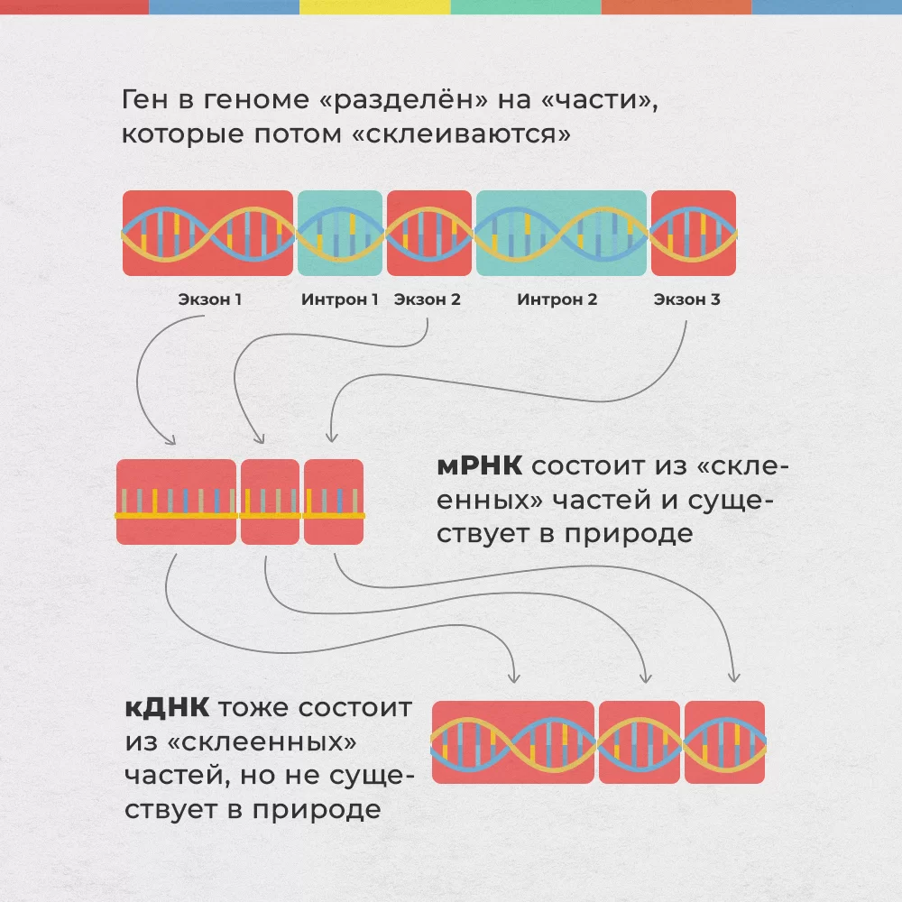 В геноме человека гены как бы разбиты на отрывки, между которыми располагается «ненужная» «информация». Информация со всего генома считывается, и то, что «не нужно»31На самом деле, это описание — грубое упрощение. Промежутки между генами заполнены регуляторными сигналами, они иногда могут считываться и добавляться к белку, или части гена могут комбинироваться в разном порядке, расширяя кодирующий потенциал генома. Этот процесс называется альтернативным сплайсингом. Там могут располагаться регуляторные элементы — некодирующие РНК и так далее. Для простоты изложения я пишу, что интроны «не нужны»., вырезается организмом; остаётся только последовательность самого гена — зрелая мРНК.