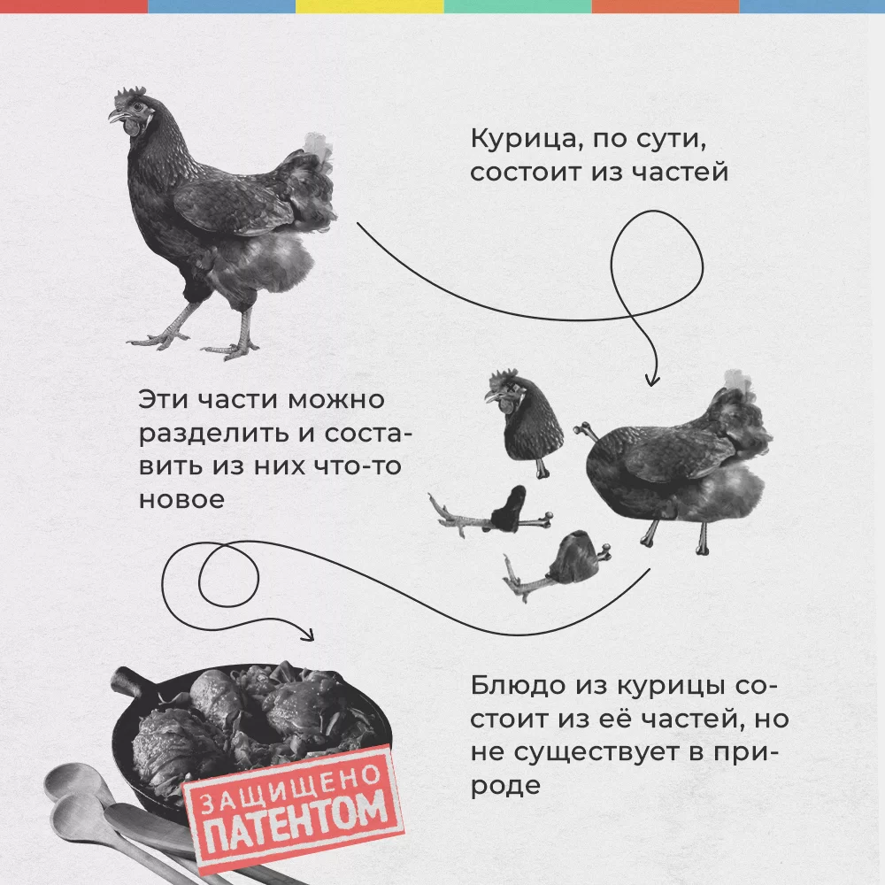 Если очень грубо упростить: ты можешь купить курицу («ДНК») в магазине, но сварить её нельзя, потому что варёная курица («кДНК») и её варка («Химическая реакция») — это нечто, что в природе не встречается и защищено патентом. Интересно, не правда ли? Покупай патент на варку курицы.