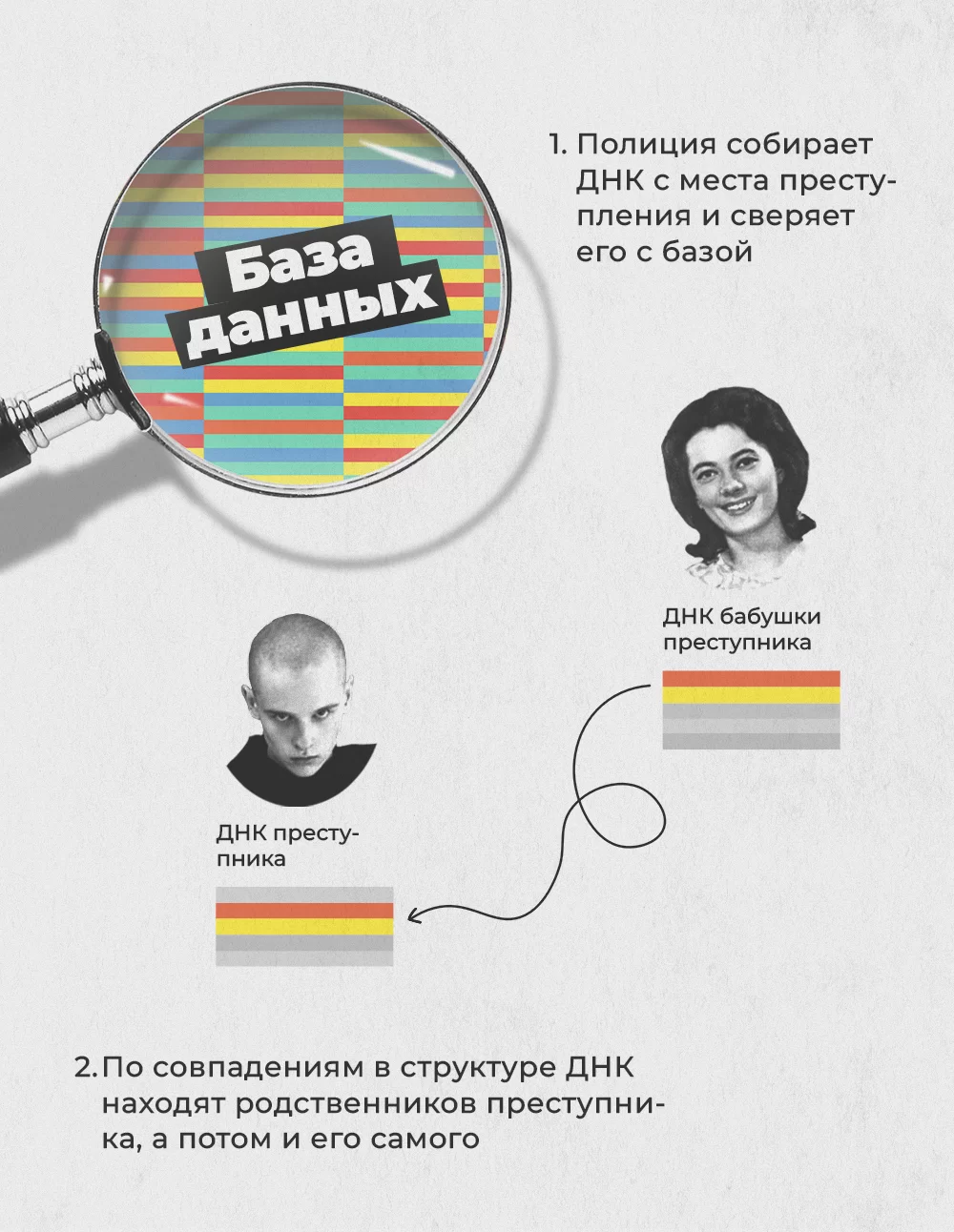 Можно поймать преступника обычными методами: опросить свидетелей, поискать мотивы и подозреваемых, а потом эту работу подкрепить образцом ДНК, собранным с места преступления. Есть и соблазн запросить доступ к генетической базе компании, которая предоставляет людям генеалогические услуги или услуги по планированию беременности.