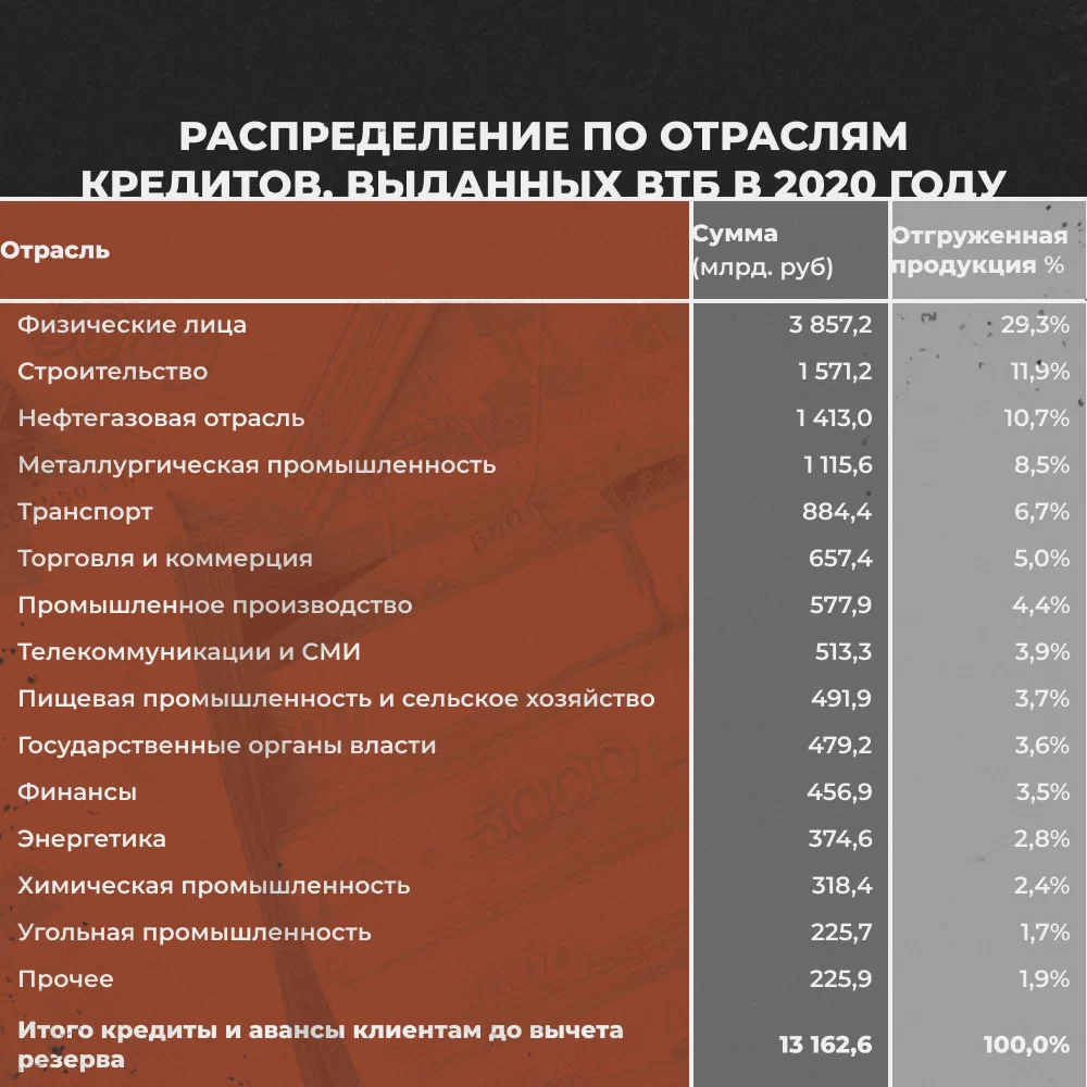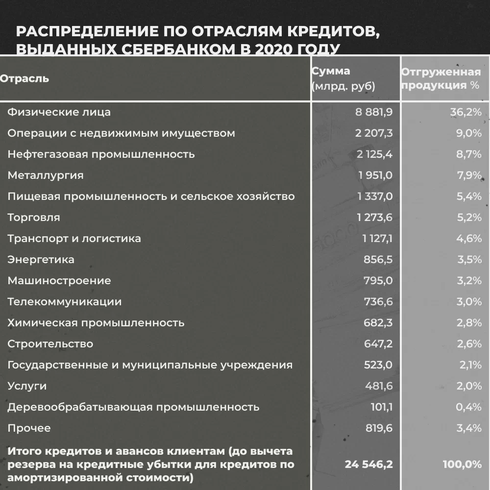 Современные российские банки исправно предоставляют кредиты промышленным предприятиям. Освежим данные, которые приводил «Политштурм», и для примера обратимся к отчётам Сбера и ВТБ за 2020 год120Публичное акционерное общество «Сбербанк России» и его дочерние организации. Промежуточная сокращенная консолидированная финансовая отчетность и заключение по результатам обзорной проверки; https://s3.open-broker.ru/site/news/R88uGLftnGa90f8uV0KB8aEPlbwgAIoJJkNp7x2l/20209mruifrs9m_presentation.pdf 121Банк ВТБ. Консолидированная финансовая отчётность с аудиторским заключением независимого аудитора; https://cdn.financemarker.ru/reports/2020/MOEX/V/VTBR_2020_12_6M_МСФО.pdf.