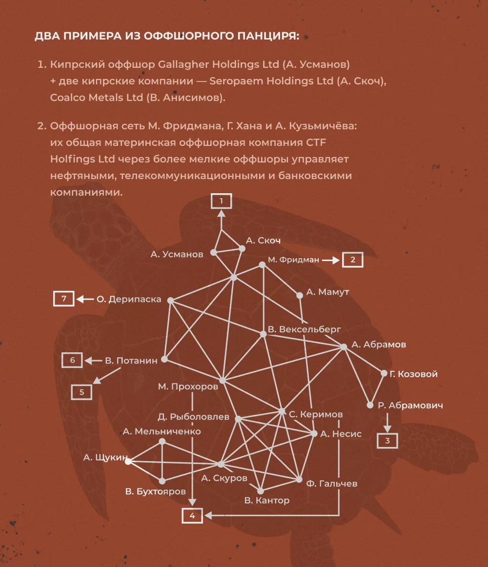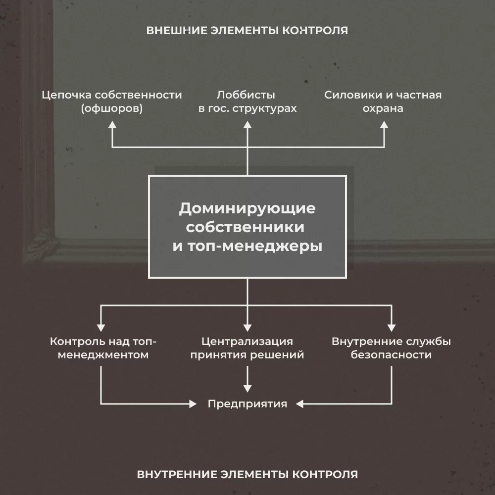 С тех пор собственность не только нелегитимная, но и нестабильная. Из-за этого бизнесмены тратят огромные средства на инфраструктуру контроля своих владений, которая позволяет управлять финансовыми потоками своих предприятий через разветвленную систему из подставных фирм, которые находятся как в России, так и за рубежом.