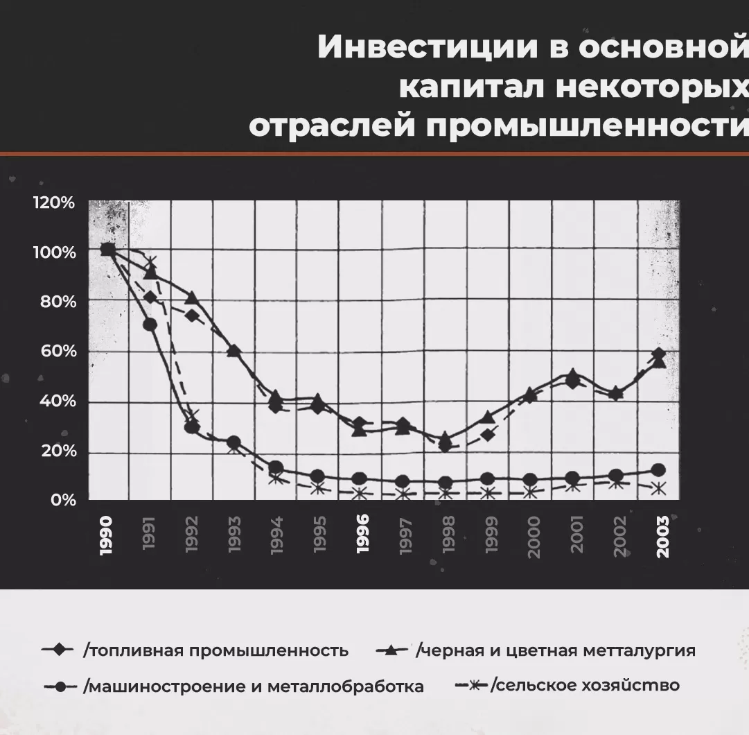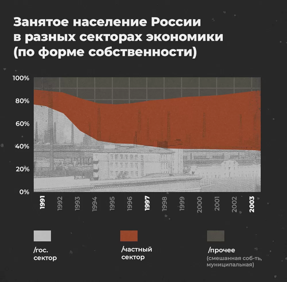 Где-то к 1994–1996 годам структура экономики существенно изменилась, когда завершилась ваучерная приватизация, а затем на залоговых аукционах «под молоток» пошли крупнейшие предприятия.
