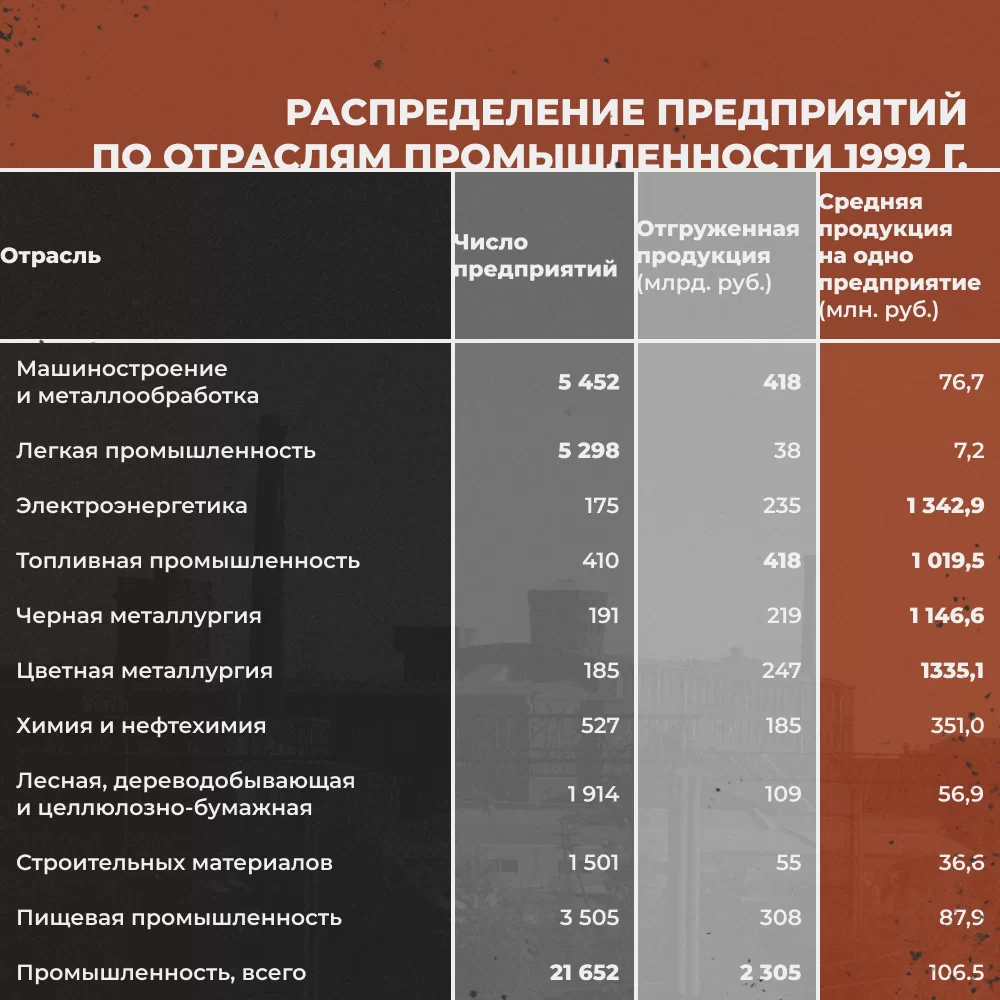 К концу ваучерной приватизации в 1994 году было приватизировано 83 % предприятий41Меньшиков С. М. Анатомия российского капитализма. — Изд. 2-е, доп. — М. : Междунар. отношения, 2008 — С. 90.. На фоне лозунгов о борьбе с монополизмом и развитии конкуренции 28 тысяч советских производственных и научно-производственных объединений раздробились на 104 тысячи предприятий в 1993 году, 137 тысяч — в 1995-м и 160 тысяч — в 1998 году42Ханин Г. И. Экономическая история России в новейшее время. Российская экономика в 1992–1998 годы : монография / Г. И. Ханин. — Новосибирск : Изд-во НГТУ, 2014. — С. 100–101.. Такой уровень раздробленности и дезорганизованности предприятий явно не соответствовал тем высоко-концентрированным производительным силам, которые достались России от СССР. Кроме того, на этой волне многие организации разрывали нормальные даже для рынка связи, уничтожая управленческие, сбытовые и снабженческие структуры43Меньшиков С. М. Анатомия российского капитализма. — М. : Междунар. отношения, 2004 — С. 86..