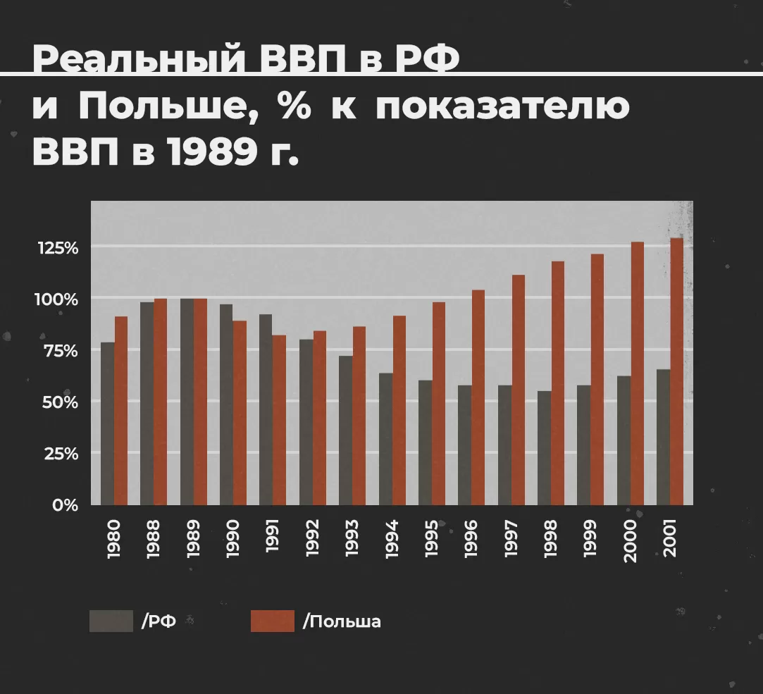 В итоге, откатываясь к рынку, по показателю ВВП Россия в 90-е показывала из года в год всё более удручающие результаты. Такой расклад дал апологетам рынка основания утверждать, что новая власть в России претворяла в жизнь либеральные реформы непоследовательно и необдуманно6Маршалл Голдман. Пиратизация России. Перевод В. И. Супруна. — Н. : ФСПИ «Тренды», 2004. — С. 324–326.. Под боком, говорят они, находилась Польша7Маршалл Голдман. Пиратизация России. Перевод В. И. Супруна. — Н. : ФСПИ «Тренды», 2004. — С. 312–326. 8Ослунд Андерс. Строительство капитализма. Рыночная трансформация стран бывшего советского блока / Андерс Ослунд; пер. с анг. Н. А. Ранневой, А.Ю. Молоканова; под ред. И.М. Осадчей. — М. : Логос, 2011. — С. 411., которая в те же девяностые, казалось бы, «планомерно» выстраивала рыночные отношения, показывая при этом совершенно другую динамику ВВП9Колганов А.И., Бузгалин А.В. Экономическая компаративистика: Сравнительный анализ экономических систем : учебник. — Москва : Проспект, 2020. — С. 485–486..