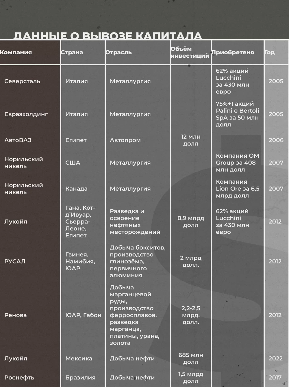 Приведём для примера данные, по которым видно, что крупный бизнес вывозил капитал или приобретал акции не только в Африке122БРИКС — Африка: партнерство и взаимодействие. М. : Институт Африки РАН, 2013. — С. 113–114. и Латинской Америке123Кузнецов А. В. Прямые инвестиции из России в страны Латинской Америки // Актуальные проблемы Европы. — 2022. — №3. — С. 258–260., но и в странах первого мира124Паппэ Я. Ш. Российский крупный бизнес : первые 15 лет: экономические хроники 1993–2008 / Я. Ш. Паппэ, Я. С. Галухина. — Москва : ГУ ВШЭ, 2009. — С. 338–413.. Здесь мы даже не принимаем во внимание постсоветское пространство.