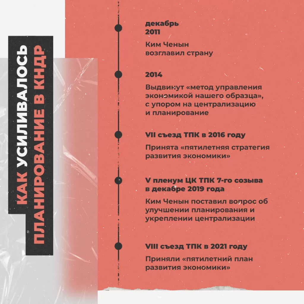 Переведённая нами статья увязывается с выступлениями Ким Ченына на VII съезде ТПК в 2016 году, на V пленуме ЦК ТПК в декабре 2019 года и на VIII съезде ТПК в 2021 году. Во всех случаях он призывал усиливать плановость и централизовывать экономику. Об этом мы писали в статье о последнем съезде партии16К нам едет ревизор // spichka: https://spichka.media/8-congress-labor-party/. Если кратко, то в 2016 году на этом съезде приняли индикативную «стратегию» развития, а в 2021 году — «план». Причём это первый план с начала 1990‑х. Видимо, чтобы быстрее проводить рыночные реформы, корейцы восстанавливают централизованное планирование. Логично.