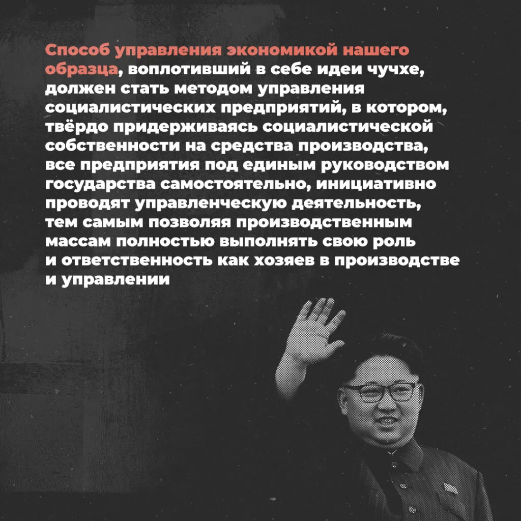 «Способ управления экономикой нашего образца, воплотивший в себе идеи чучхе, должен стать методом управления социалистических предприятий, в котором, твёрдо придерживаясь социалистической собственности на средства производства, все предприятия под единым руководством государства самостоятельно, инициативно проводят управленческую деятельность, тем самым позволяя производственным массам полностью выполнять свою роль и ответственность как хозяев в производстве и управлении»3Наш перевод статьи Тан Кёнхо; смотри источник ниже..