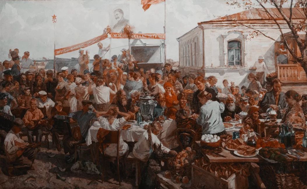 Формально картина соответствует правилам официозного соцреализма: счастливые колхозники, изобилие пищи, портрет вождя, взирающего с «небес» на свой народ.