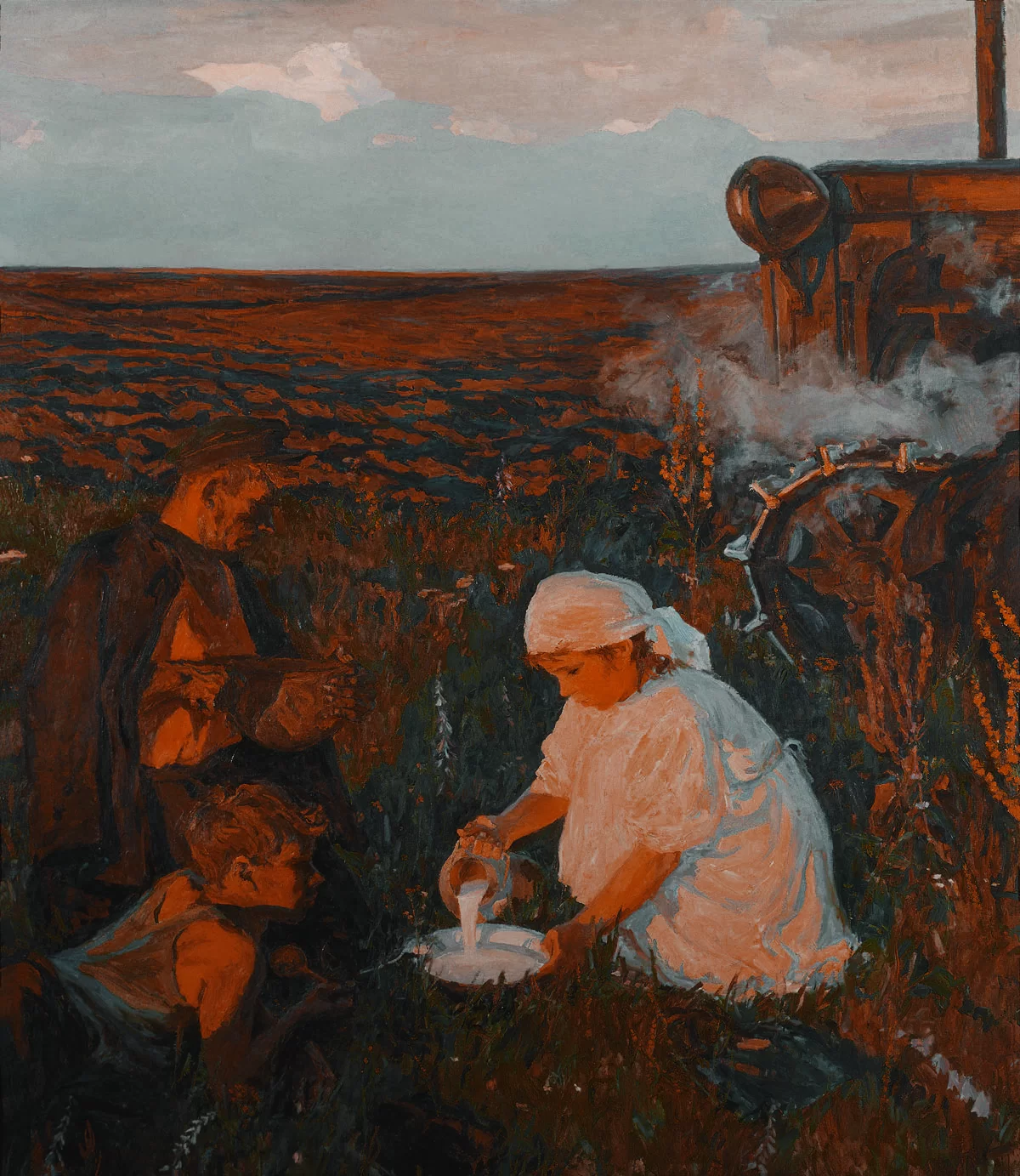 «Предвечерняя тишина, разлившаяся по ниве, сковала и образы людей. Если бы справа не был изображён ещё не остывший трактор, то зрителю представилась бы… картина того, как работал потихоньку-полегоньку в поле пахарь со своей сохой, а теперь присел отдохнуть и закусить».28Цит. по: Морозов А. И. Соцреализм и реализм. — М. : Галарт, 2007. — С. 169.