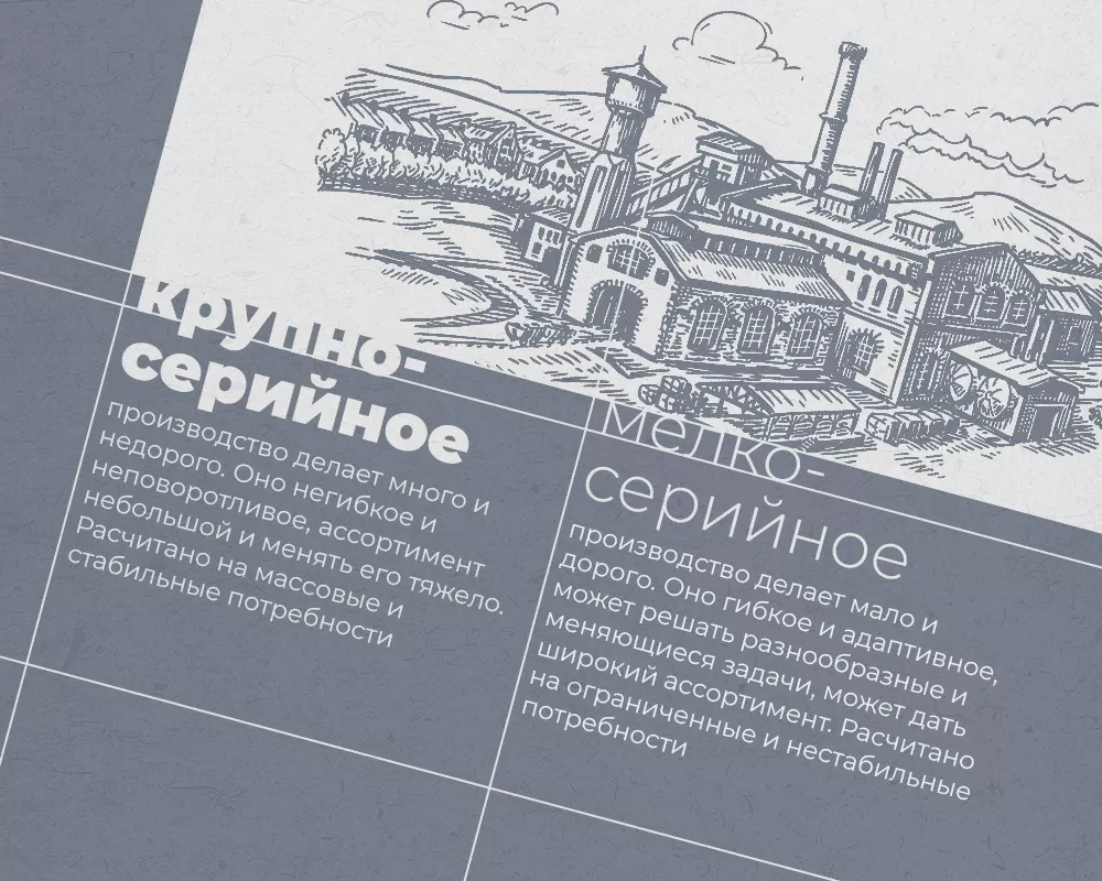 Единичное производство в потребительском секторе редко встретишь. Это или производство средств производства, или громадные проекты вроде космических аппаратов, авианосцев, стадионов. Чтобы решить проблему специфических уникальных потребностей, нам нужно серийное и мелкосерийное производство, которое выпускает однотипные изделия, делает их из однотипного сырья и в больших объёмах, чем единичное производство. Такой вариант достаточно гибок и может работать под заказ4Рыжов Е.В., Бахотский В.В. Р30 Организация и планирование производства: учебное пособие. – Псков: Псковский государственный университет, 2013. – с. 16.