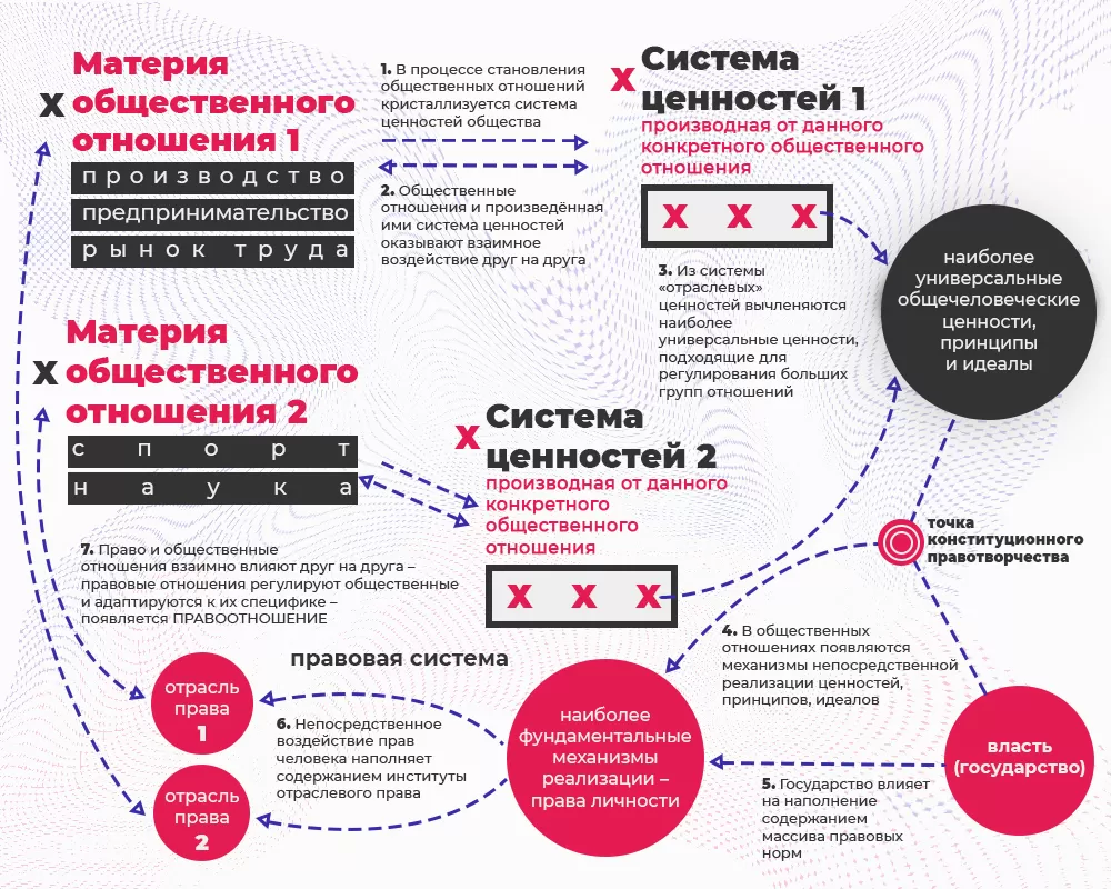 В этом смысле право как сфера отношений надстройки достигает, пусть и относительной, самостоятельности по отношению к базису14См., например, Архипов С. И. Собственность: правовые грани: монография. — М. Юрлитинформ, 2014. — С. 22–29.. Спорт, труд, предпринимательство, экология ― право пропускает такие сферы общественной жизни через призму нормативности: порождает, сохраняет, развивает и прекращает общественные отношения внутри них посредством норм. Совокупность этих норм складывается в нечто большее, чем просто сумму своих частей, и удовлетворяет интересам тех или иных сил общества ― поэтому мы можем говорить о таком явлении, как «правовая политика».