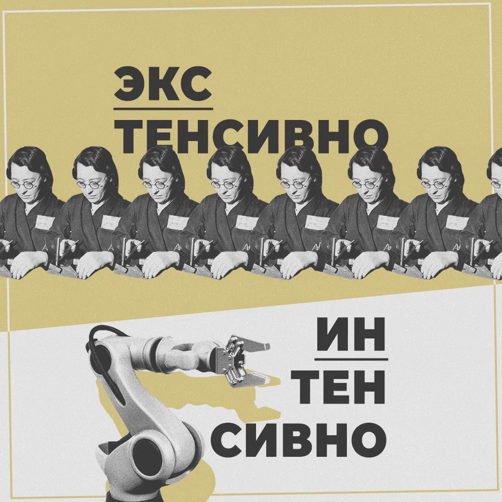 Капитал может наращивать производство экстенсивно — увеличивая количество занятых на производстве работников; и интенсивно — внедряя инновации и развивая средства производства и способы организации труда.8Маркс К. Капитал. Критика политической экономии. — Т. 1. — М. : Политиздат, 1951. — С. 631–632.
