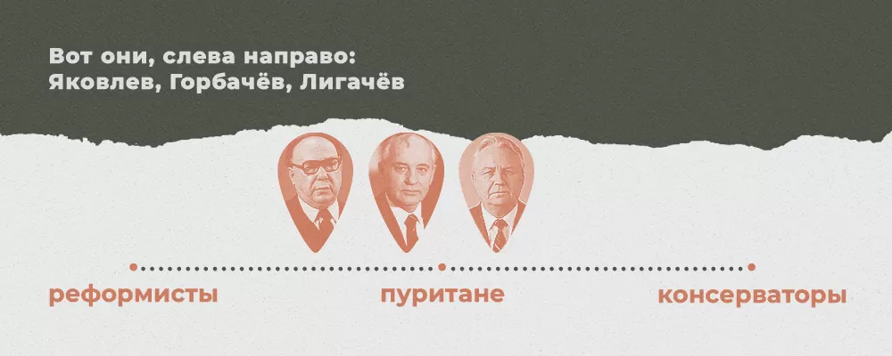 В марте 1985 года генеральным секретарём стал Михаил Горбачёв. Члены его команды тяготели к группе «пуритан». Но одни были ближе к консерваторам, например Егор Лигачёв13Партийный деятель. Секретарь ЦК КПСС в 1983–1990 годах. Член политбюро в 1985–1990 годах. Депутат Государственной Думы III созыва от КПРФ в 1999–2003 годах., другие — к реформистам, как Александр Яковлев14Партийный деятель. Один из идеологов перестройки. Получил прозвище «Архитектора перестройки»..