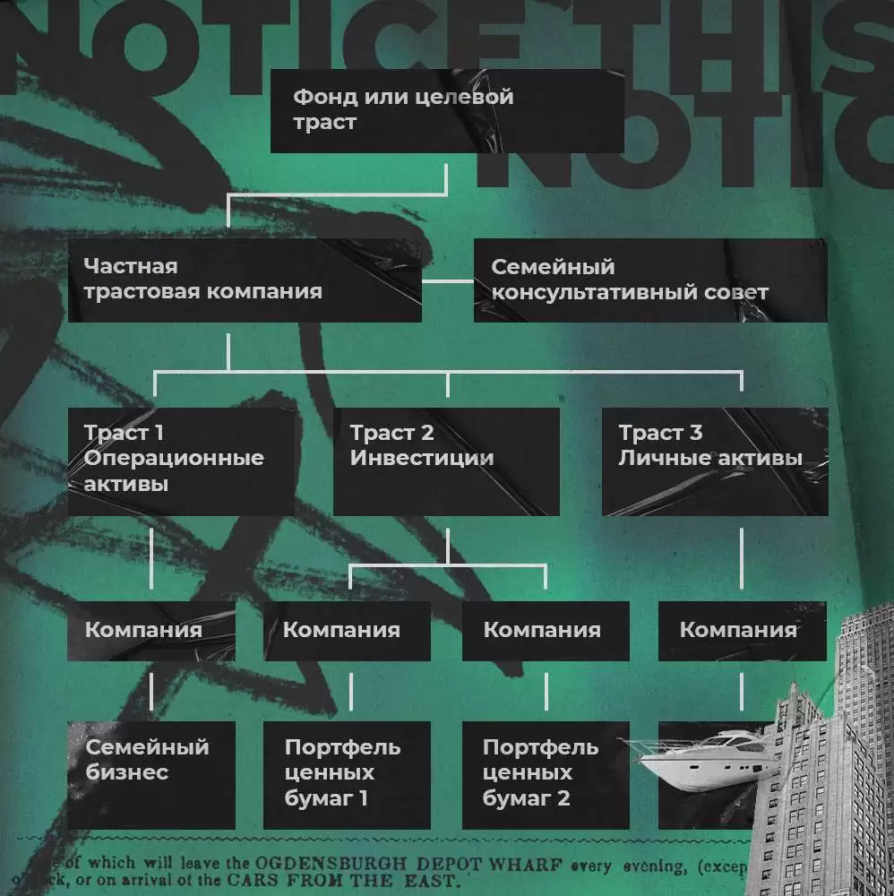 Скажем, у некой семьи есть собственность: бизнес, два портфеля ценных бумаг, яхта и несколько объектов недвижимости. Они раскиданы по разным компаниям, учреждённым трастами.