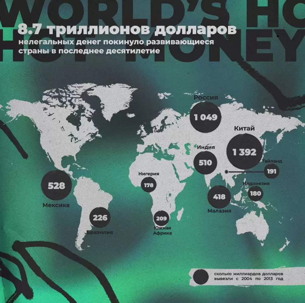 Оценить реальные объёмы средств, которые утекают в офшоры и трасты, трудно. Согласно статье Джона Кристенсена, одного из авторов Tax Justice Network (TJN)12Tax Justice Network (TJN, Сеть Налогового Правосудия с англ.) — организация, которая призывает контролировать финансы и поддерживать их открытость, повышать налоги и противодействовать крупным корпорациям — так они себя позиционируют, во всяком случае. Данные, приводимые TJN, могут быть очень примерными., личное состояние на общую сумму в 11,5 трлн долларов хранится в офшорах крупными капиталистами, уклоняющимися от уплаты налогов. За границу утекает более 250 млрд долларов в год13Christensen J. The hidden trillions: Secrecy, corruption, and the offshore interface // Crime, Law and Social Change. — 2012. — Т. 57. — № 3. — С. 325–343..