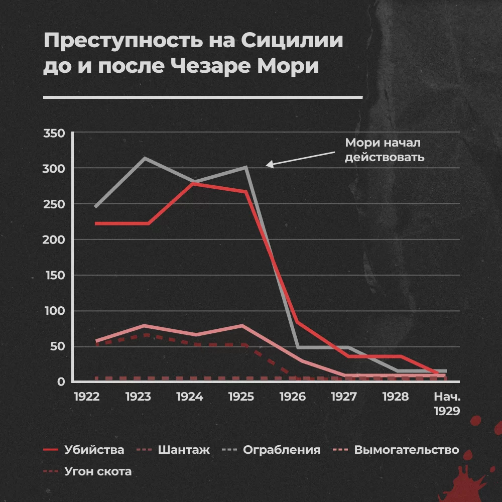 Таким образом, с 1925–1929 годов мафия, по крайней мере до операций Чезаре Мори, имела внушительные связи в государственном аппарате, а доминирование в сицилийском обществе кодекса молчания над законом точно так же использовалось мафией, как в XIX веке. Однако после антимафиозной кампании влияние мафии на Сицилии было подорвано, а уровень преступности в общем упал, но всё же это не позволило раз и навсегда избавиться от мафии на острове.