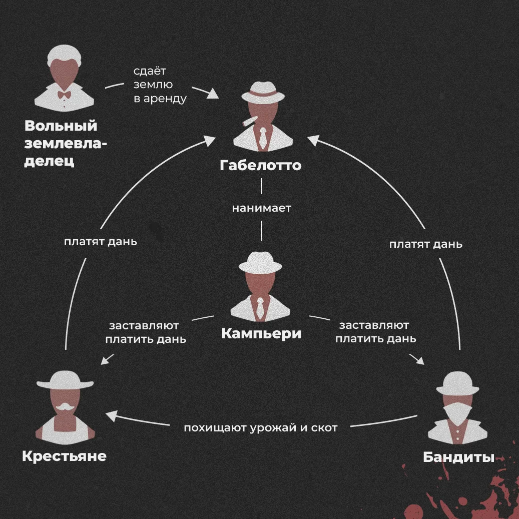 Просто так помещик уехать тоже не мог: надо было оставить кого-то, кто будет следить за хозяйством. Помещик начал сдавать землю в аренду «габеллотти» — выходцам из среднего класса. Габеллотти2Часто исследователи ОПГ приравнивают габеллотти к мафии или рассматривают вторых как закономерное развитие первых. Например: Д. Дикки, Д. Сарделл, А. Блок и другие. должны были собирать налоги, принуждать крестьян к труду и защищать имущество помещика3Sardell J. Economic Origins of the Mafia and Patronage System in Sicily. 2009. — P. 4.. Последнее было особенно актуально из-за разгула преступности. Ниже парочка цитат, подтверждающих это.