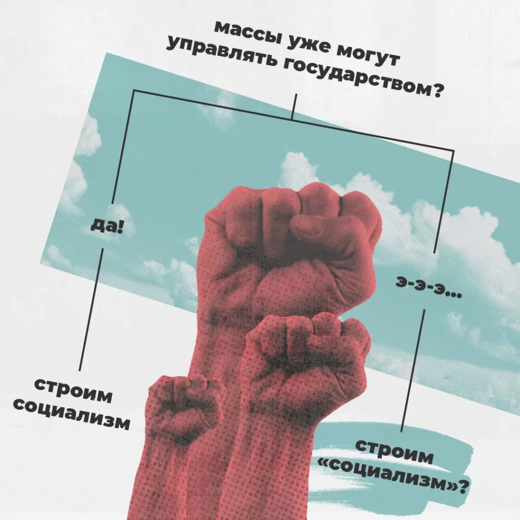 Сегодня считается, что в Советском Союзе построили социализм. Так считалось и раньше. Но нам кажется, что его там всё-таки не построили. Чтобы его возвести, недостаточно водрузить красный флаг на купол Сенатского дворца или всюду развесить портреты Маркса. Надо сделать частную собственность общественной, вооружить как можно больше рабочих, а также позволить каждому из них управлять государством. Ни первого, ни второго, ни третьего в Союзе добиться в полной мере не смогли.