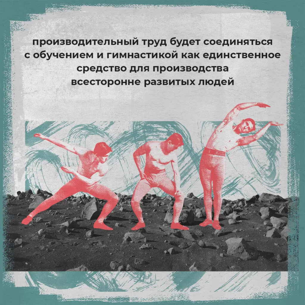 «…из фабричной системы… вырос зародыш воспитания эпохи будущего, когда для всех детей свыше известного возраста производительный труд будет соединяться с обучением и гимнастикой не только как одно из средств для увеличения общественного производства, но и как единственное средство для производства всесторонне развитых людей»40К. Маркс, Ф. Энгельс. Полное собрание сочинений: в 39 т. — 2‑е изд. — М. : Госполитиздат, 1961. — Т. 23. — С. 494–495..