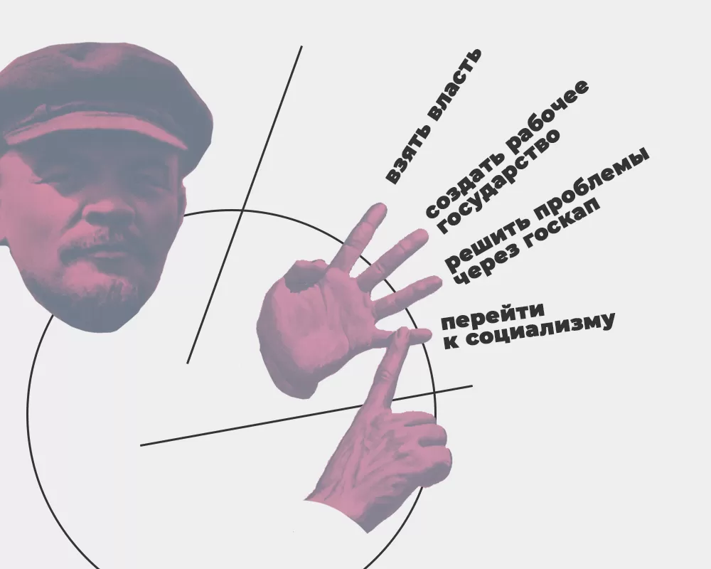Ленин излагал это в «Апрельских тезисах», но в более развёрнутом виде он говорил о них в «Грозящей катастрофе». Далее он говорил про многоукладность России — с ней надо что-то делать. Например, в сельском хозяйстве надо внедрять элементы капитализма, товарное производство на селе. Главный уклад, который должен торжествовать, — капиталистический, но не просто капиталистический, а государственно-капиталистический. В более развернутом виде это изложено в «Очередных задачах советской власти».