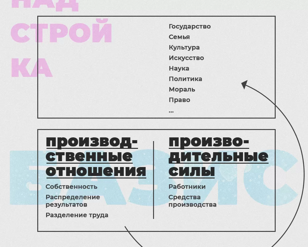 Неразрывная связь производительных сил и производственных отношений составляет базис, на котором возникают социальные и политические институты, мораль, идеология — всё, что оформляет общественное устройство.