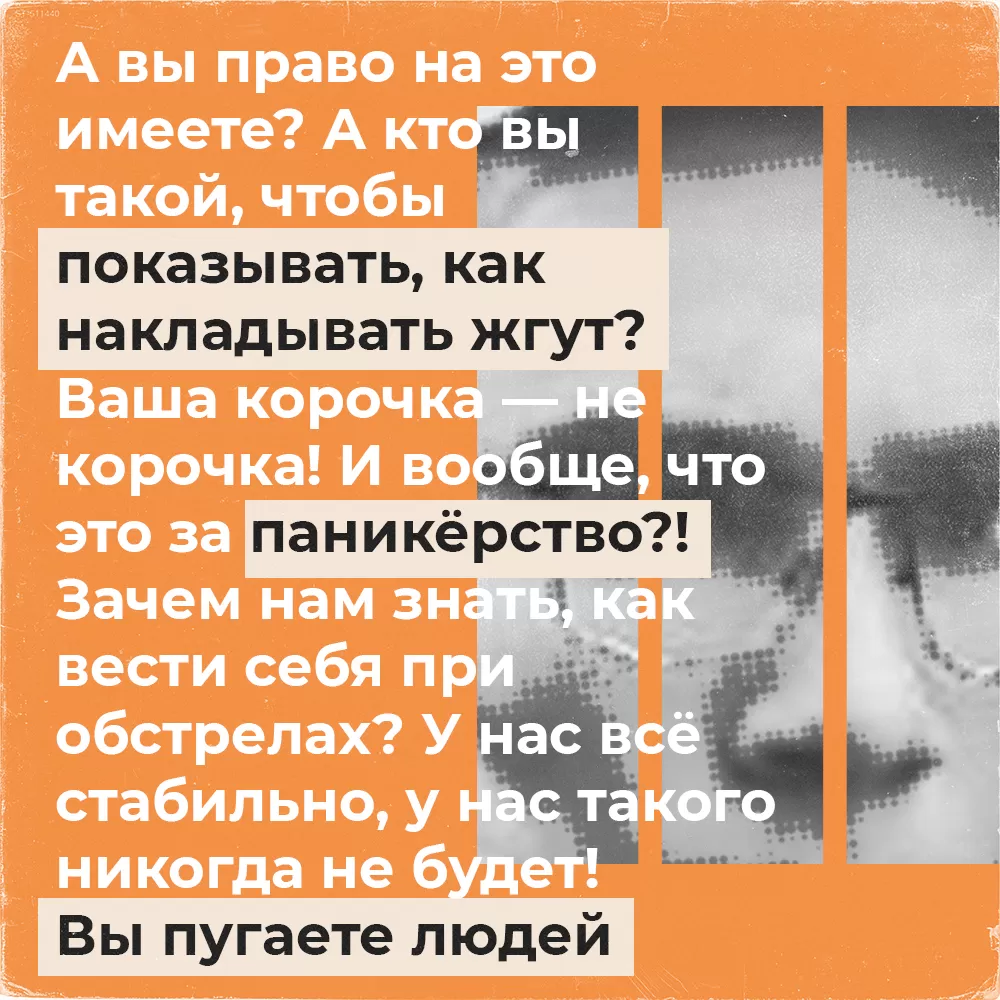 — Так и было. Всё за один разговор. Собрали в актовом зале всех работников администрации в течение нескольких минут. И нам устроили просто суд Линча. Опустили — как только могли. Мы спокойно начинаем занятие, показываем всё, начинаются придирки. А вы право на это имеете? А кто вы такой, чтобы показывать, как накладывать жгут? Ваша корочка — не корочка! И вообще, что это за паникёрство?! Зачем нам знать, как вести себя при обстрелах? У нас всё стабильно, у нас такого никогда не будет! Вы пугаете людей! В этом усердствовала … и какой-то юрист, имени не знаю. Этот юрист пытался нас на нормативно-правовой базе ловить, экзамен какой-то устраивать, но Александр, как я уже сказал, юрист по основной специальности, это у них попросту не вышло. В конце концов, банальным хамским поведением занятие было сорвано и закончилось митинговой речью …, которая пристыдила нас за неверие в родную армию. Мол, вы что думаете, родная армия нас не защитит?! Самый главный перл. Почти дословная цитата: «На территории соседних районов есть специальные воинские части, там сидят специальные люди, и когда В. В. … отдаст им приказание, эти специальные части приедут, противогазы подвезут и всех обучат первой помощи». Фраза «противогазы подвезут» среди нашей компании стала локальным мемом, обозначающим слепую веру администрации, надежду на волшебника в голубом Камазе. Мы пытались воззвать к голосу разума, что мина или снаряд, если они прилетят, прилетят куда быстрее, чем В. В. … подпишет указ, быстрее, чем некие «специальные части» приедут на место, и уж точно быстрее, чем они «противогазы подвезут». А до того времени надо уметь помочь себе самому. Таким вот воспрепятствованием нашей деятельности они нарушали не только Конституцию, но и 28 ФЗ «О гражданской обороне», 48 ФЗ «Об общественных объединениях» и даже, на худой конец, законы … области! Там прямо сказано, что население должно повышать знания в области ГО ЧС. Увы, услышаны мы не были. Ты фильм «Дурак» смотрел? То же самое. Крысятник, в который бросили петарду. Мы сразу пытались дистанцироваться — мы не ревизоры, нас публичная сторона дела не интересует. Дайте нам сделать, что мы можем, и мы уедем обратно, откуда приехали. Мы помогать приехали. Бес-плат-но.