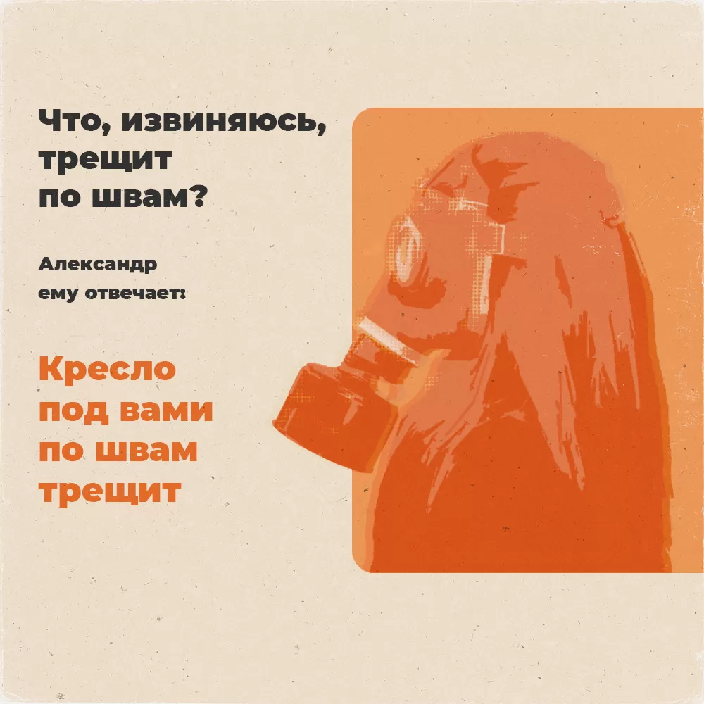 Что вот хорошего хочу сказать, так это то, что в самой … поставили новейшую систему оповещения, с этим всё хорошо, но сигнал у неё речевой. Ре-че-вой. Ну ладно сирена ещё, но как речевой сигнал будет слышно за 15–20 километров в тех же …? Помню, на выходе, как расходились, я бросил фразу: «Прямо как в старом мультике. Всё трещит по швам, а они: „Всё хорошо, прекрасная маркиза…“». Тут же среагировал юрист, тот самый. Ехидно так переспросил: «Что, извиняюсь, трещит по швам?». Александр ему отвечает: «Кресло под вами по швам трещит».