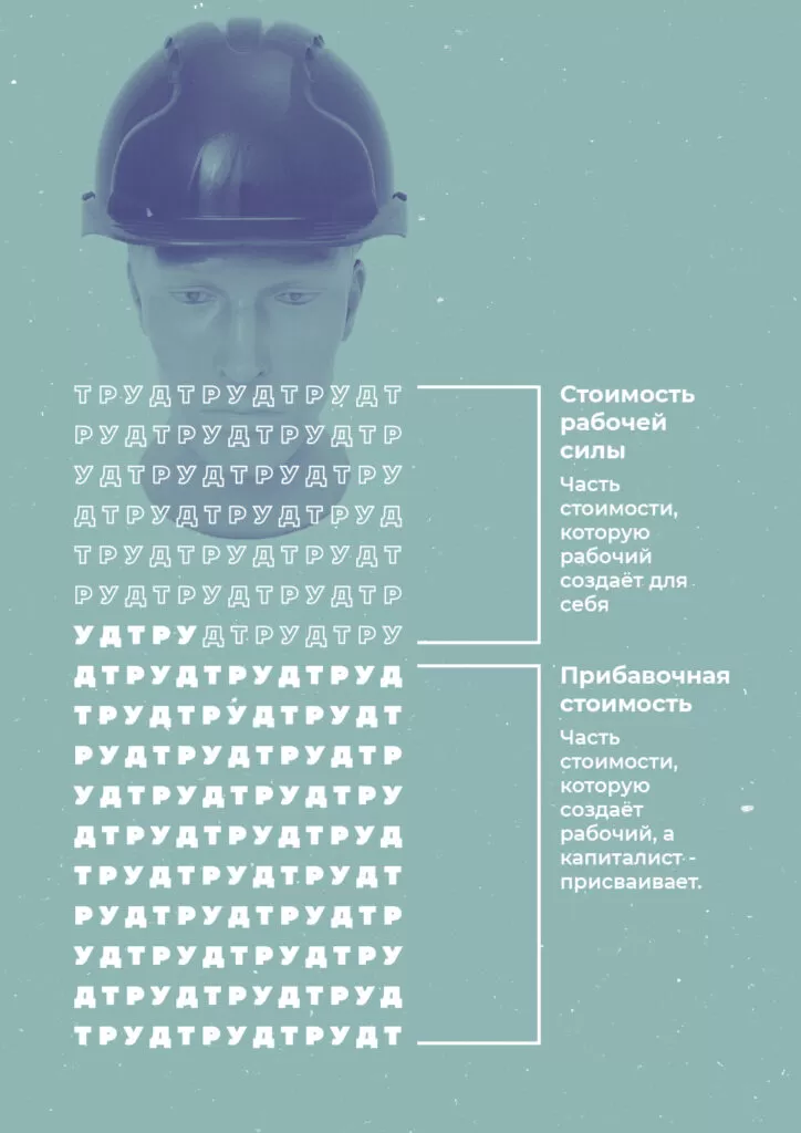 Мы выяснили, что работник получает в виде зарплаты не стоимость собственного труда, а только стоимость своей рабочей силы — то, что необходимо ему, чтобы поддерживать свою работоспособность.