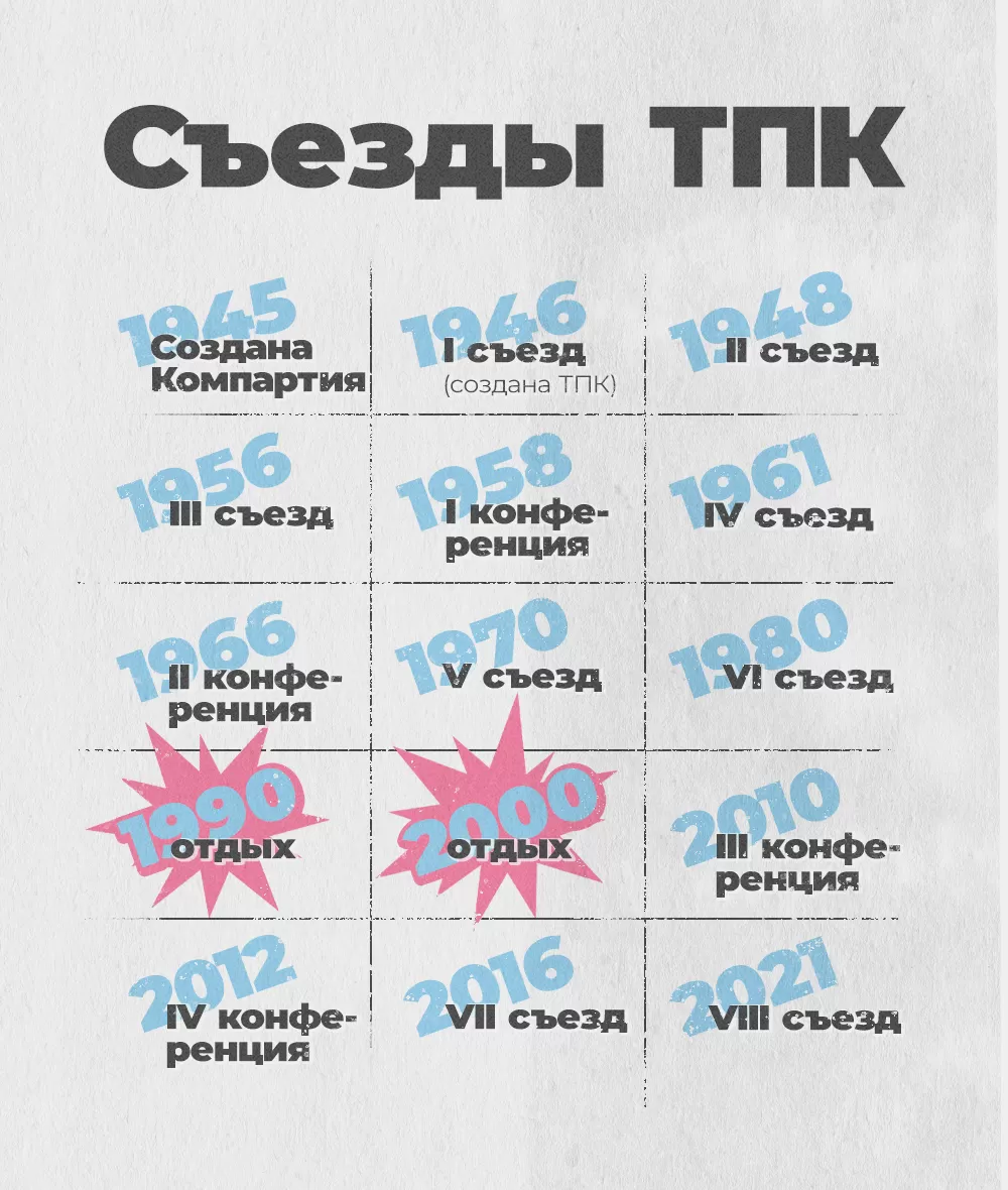 1990-е были тяжёлыми для ТПК. С тех пор как в 1994-м страну возглавил Ким Ченир, партия перестала работать по Уставу: никаких съездов и даже пленумов ЦК.